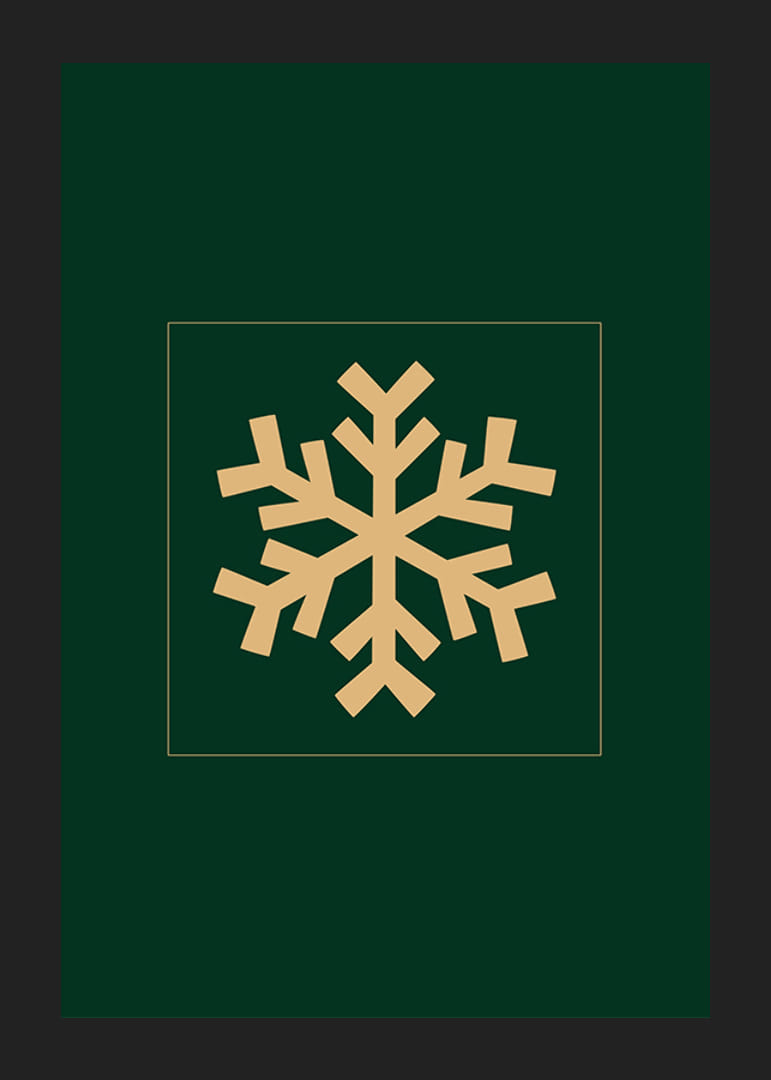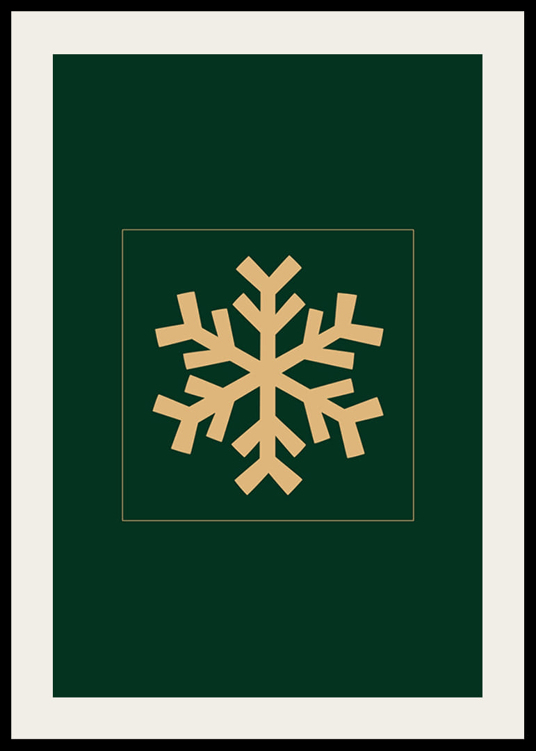 Motív pozostáva zo štylizovanej snehovej vločky v matnej zlatej farbe umiestnenej v strede na tmavozelenom štvorcovom pozadí. Jednoduchý a grafický tvar dodáva moderný nádych, zatiaľ čo výber farieb pripomína zimu a Vianoce. Tento plagát sa dobre hodí do obývačky alebo chodby počas zimného obdobia.