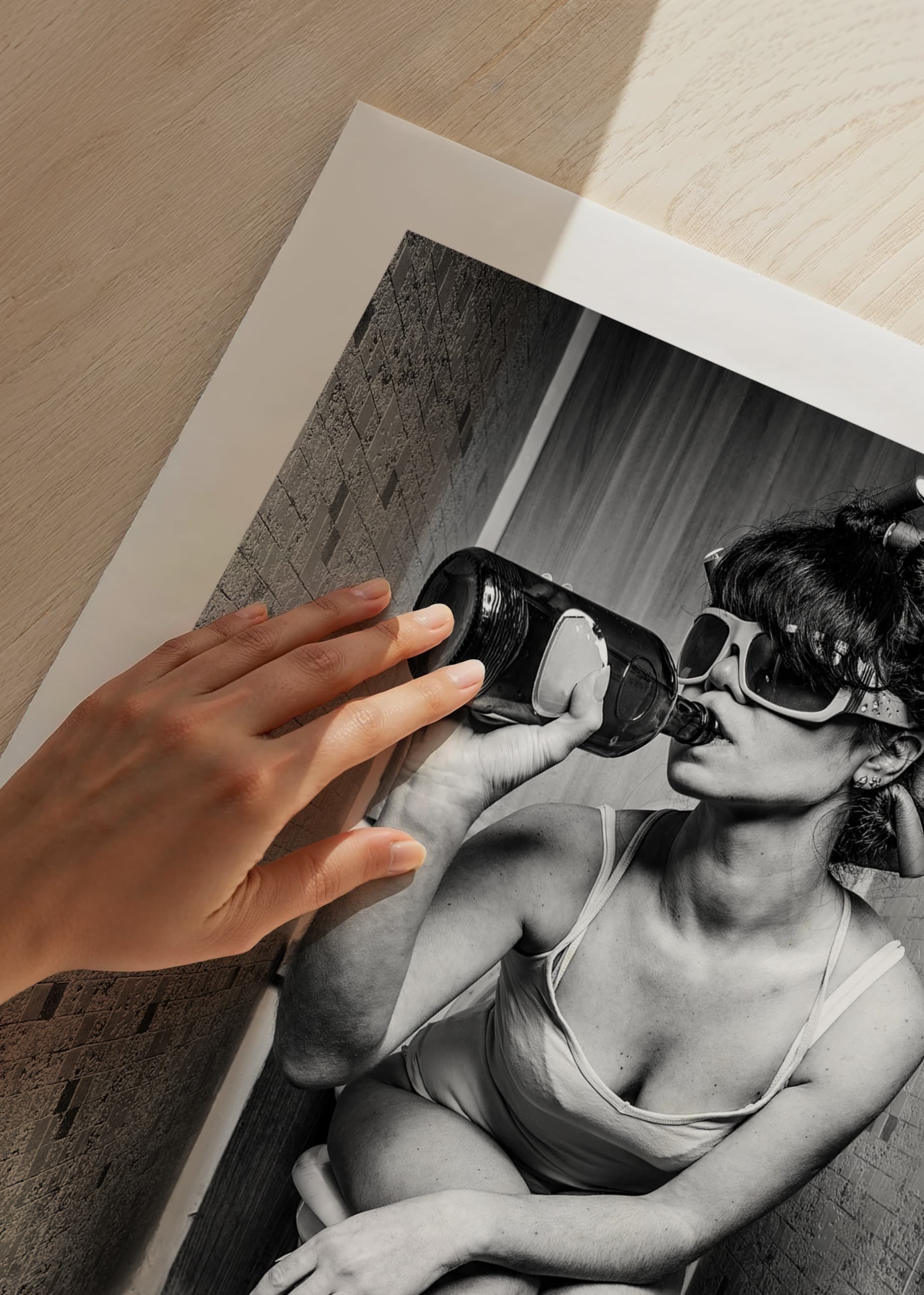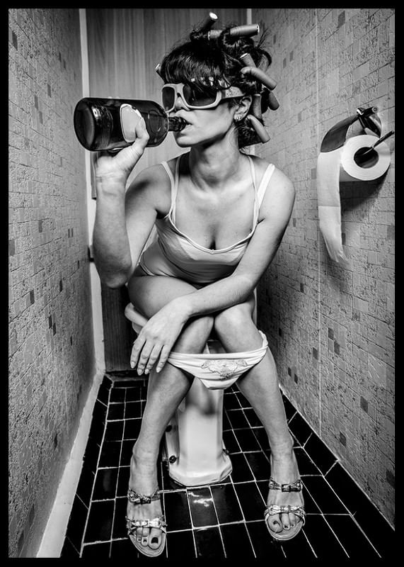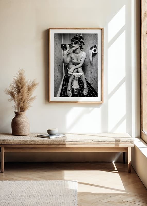 Motív pozostáva z ženy s natáčkami a slnečnými okuliarmi, ktorá sedí v spodnej bielizni na toalete a pije priamo z fľaše. Čiernobiele kontrasty a stiesnené prostredie dodávajú motívu štýlový a zároveň humorný charakter. Tento plagát sa hodí do moderných domácností s priestorom pre osobitý prístup a hravosť.