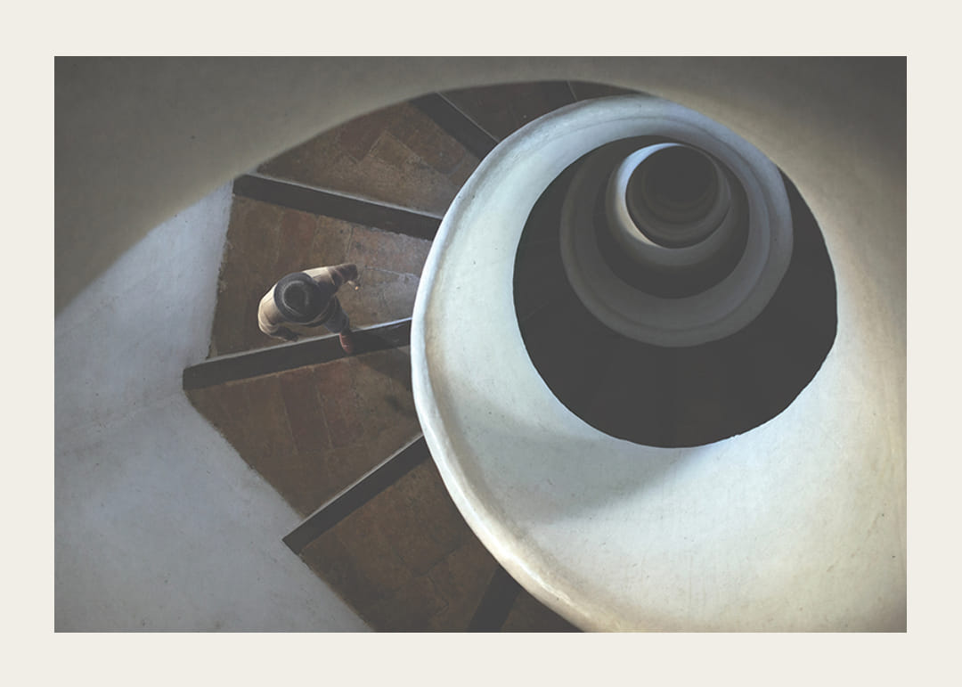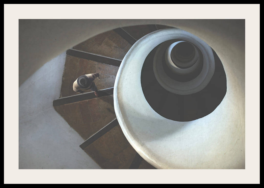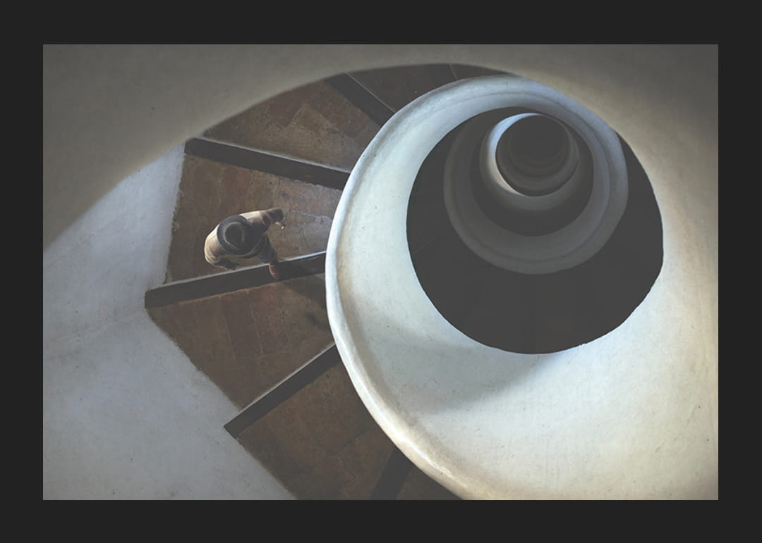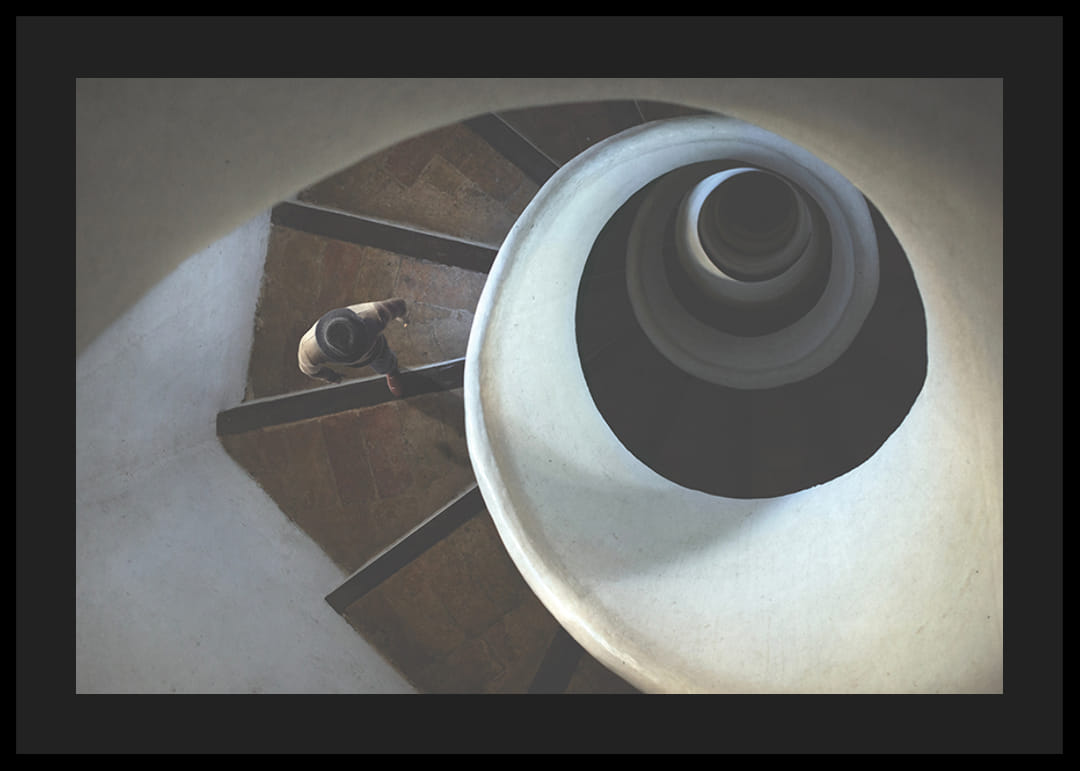 Motív zobrazuje muža s klobúkom kráčajúceho po točitom schodisku, zachyteného zhora s jasnými, jemnými líniami a jemným svetlom. Organické tvary schodiska a hra tieňov vytvárajú grafický a koncepčný výraz. Tento plagát pôsobí moderným dojmom a dobre sa hodí napríklad do chodby, obývačky alebo pracovne.