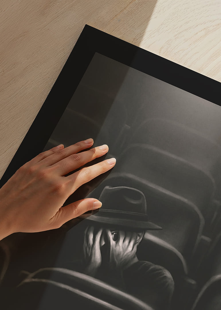 Osamelý muž sedí medzi prázdnymi radmi sedadiel v slabo osvetlenom kine a skrýva si tvár v dlaniach. Tlmené sivé tóny motívu a jemné osvetlenie vytvárajú pocit izolácie a napätia. Vďaka svojmu konceptuálnemu vyjadreniu je tento plagát zaujímavým doplnkom obývačky, pracovne alebo chodby.