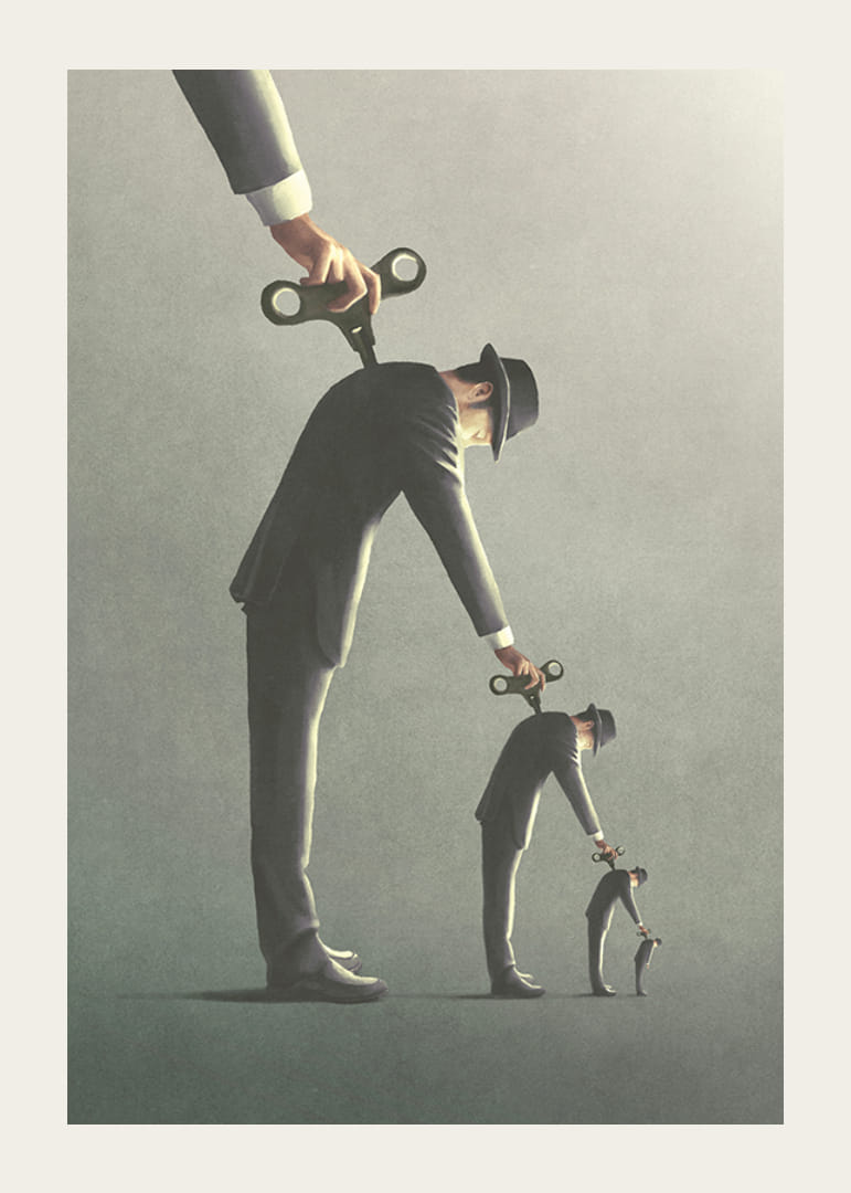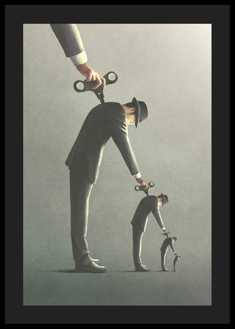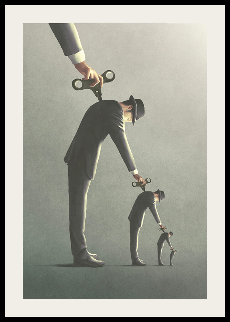 Motív pozostáva z opakovania sa mužov v sivých oblekoch a klobúkoch, kde každá postava je menšou verziou seba samej s klasickým kľúčom na chrbte. Jemné, tlmené farebné tóny a minimalistické pozadie dodávajú plagátu koncepčný a premyslený nádych. Vhodný do pracovne alebo chodby na vyvolanie zamyslenia.