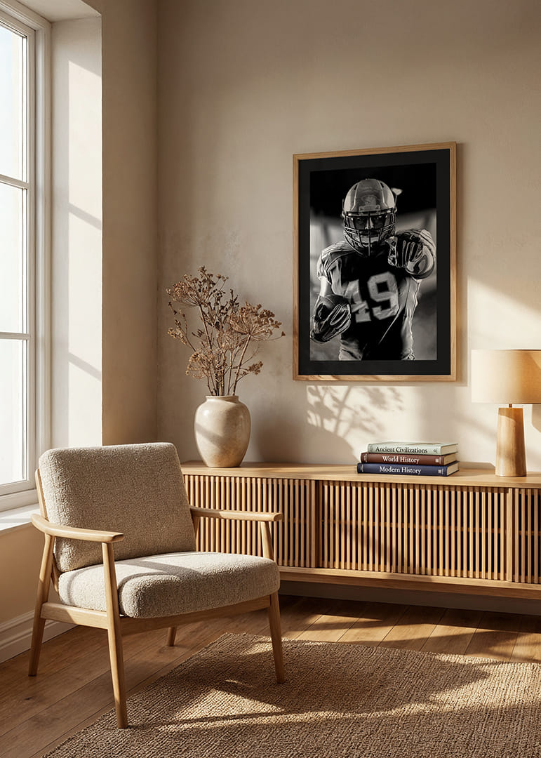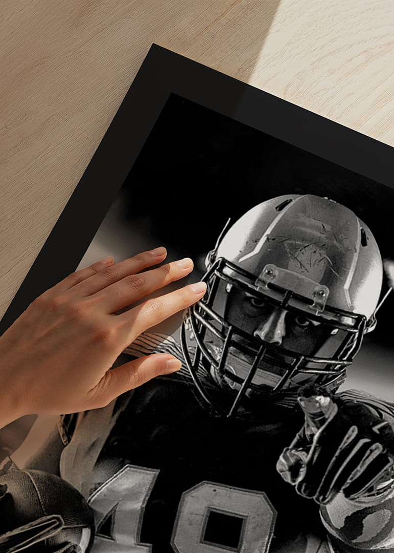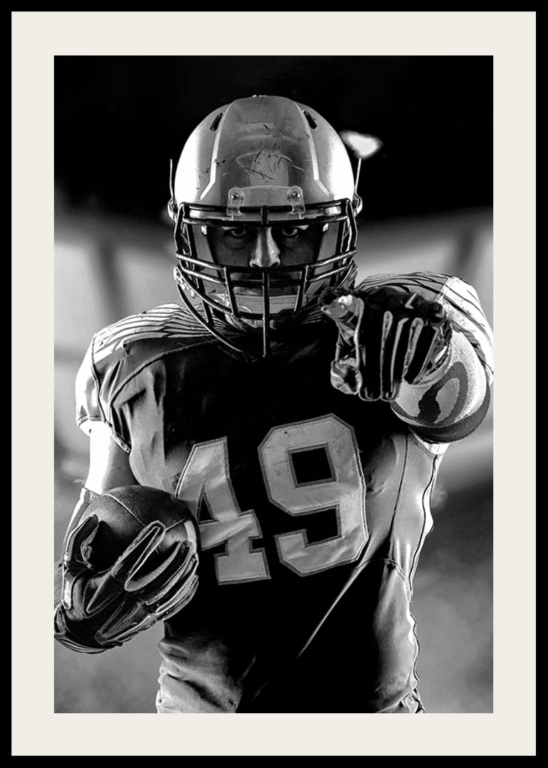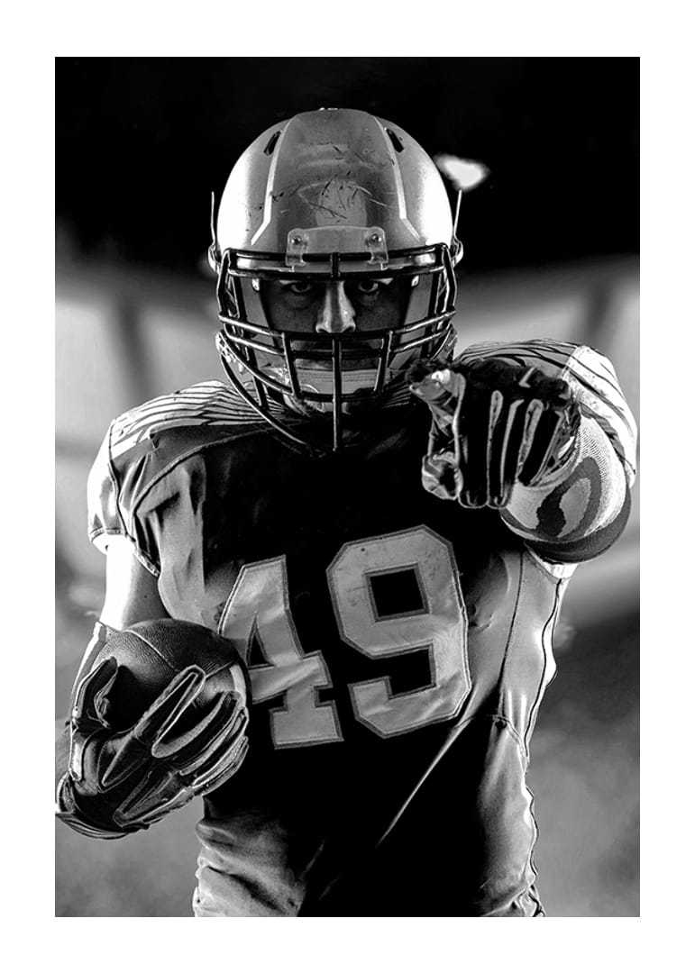 Detailný záber hráča amerického futbalu v plnej výstroji, čiernobielo vyfotografovaný so zameraním na číslo 49 smerujúce k fotoaparátu. Detailné kontrasty a vertikálna kompozícia vytvárajú silný vizuálny výraz. Tento plagát je ideálny do športovo inšpirovaných prostredí a izieb pre mládež.