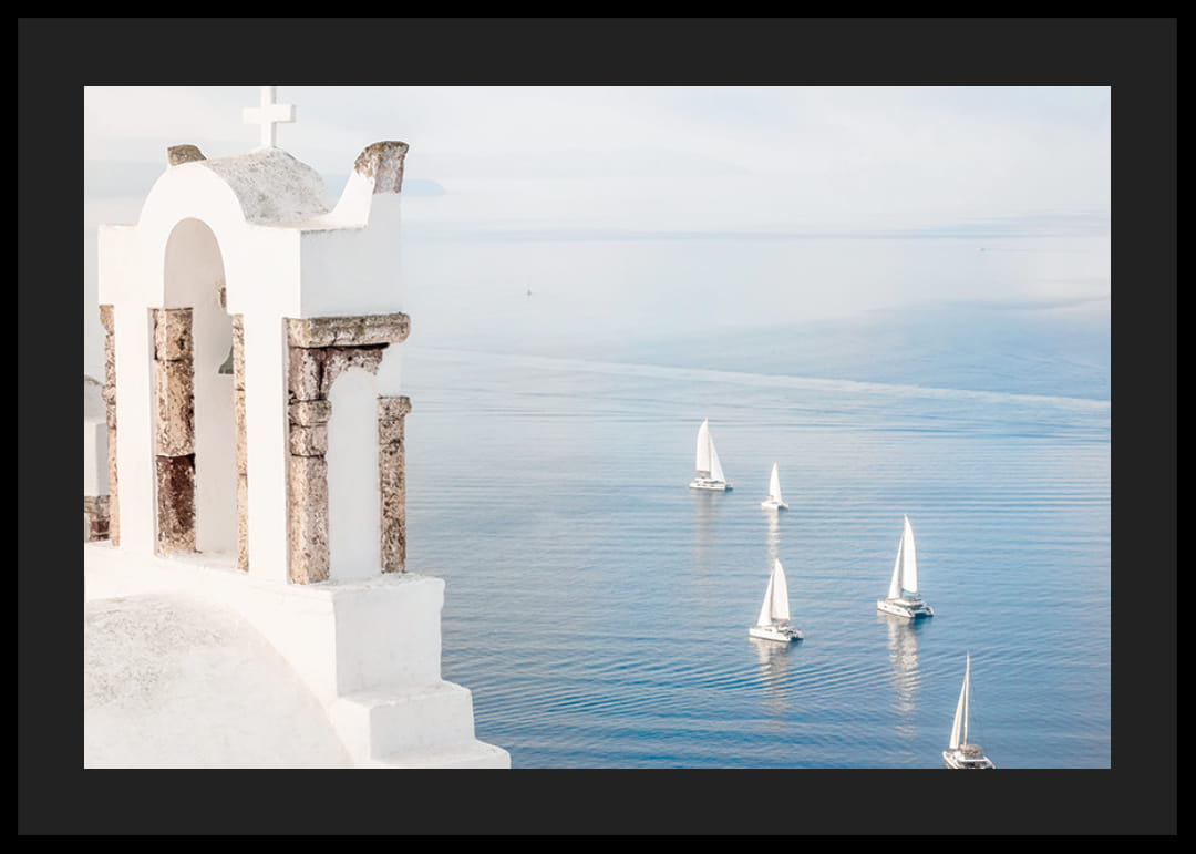 V popredí je viditeľný obielený kostol s charakteristickou kupolou a krížom, zatiaľ čo niekoľko plachetníc sa kĺže po pokojnom modrom Egejskom mori. Tlmené farby a otvorená krajina vytvárajú vzdušný dojem. Tento plagát s motívom zo Santorini Greece č. 3 vyvoláva atmosféru gréckeho ostrova a je vhodný do miestností, kde chcete svetlú a uvoľnenú atmosféru.