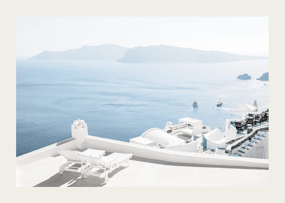 Biele terasy a ležadlá sa rozprestierajú nad tmavomodrým Egejským morom na Santorini v Grécku. V diaľke sú viditeľné skalnaté ostrovy a plachetnice sa pohybujú po vode. Jasná farebná schéma a štýlová kompozícia plagátu sú ideálne do miestností, kde túžite po pocite pokoja a dovolenkových snov.