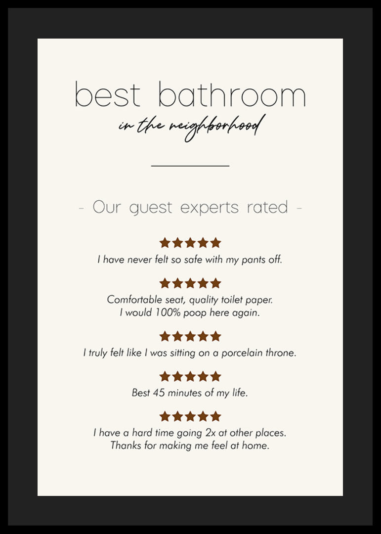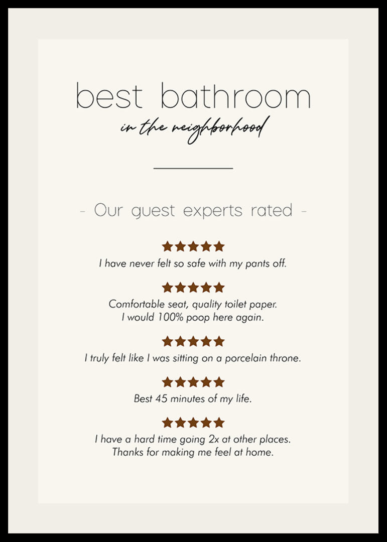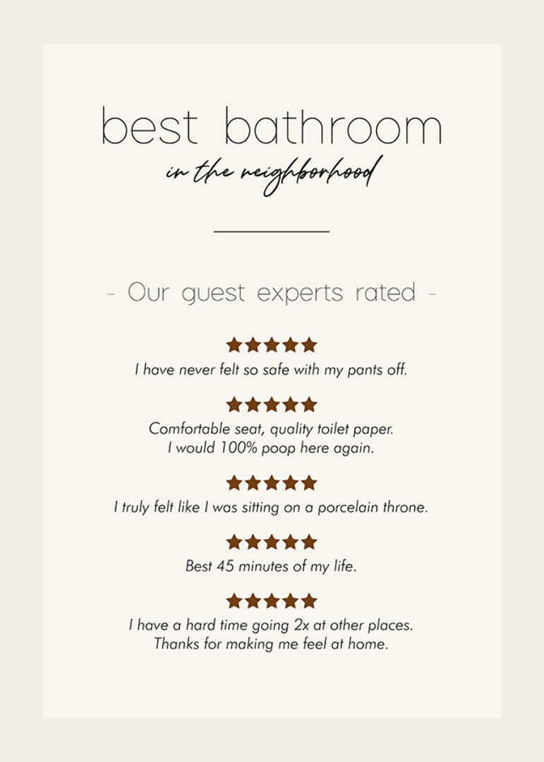Hravá typografia s čiernym textom „najlepšia kúpeľňa v okolí“ na béžovom pozadí. Nižšie je uvedených päť humorných recenzií hostí v angličtine, pričom každý riadok začína piatimi hnedými hviezdičkami. Tento plagát dodáva kúpeľni a toalete hravý nádych a interiéru dodáva osobný nádych.