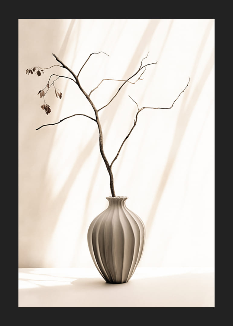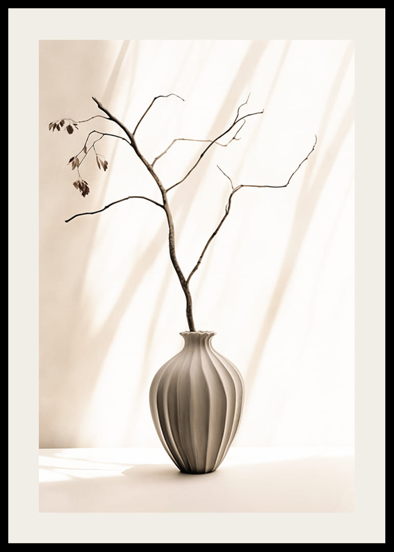 Osamelý konár s niekoľkými sušenými listami stojí v tvarovanej keramickej váze s jemnými líniami. Pozadie je svetlé s jemnými tieňmi, ktoré vytvárajú pokojný dojem. Minimalistická kompozícia je vhodná pre plagáty pre tých, ktorí hľadajú jednoduchý a štýlový výraz v obývačke, chodbe alebo pracovni.