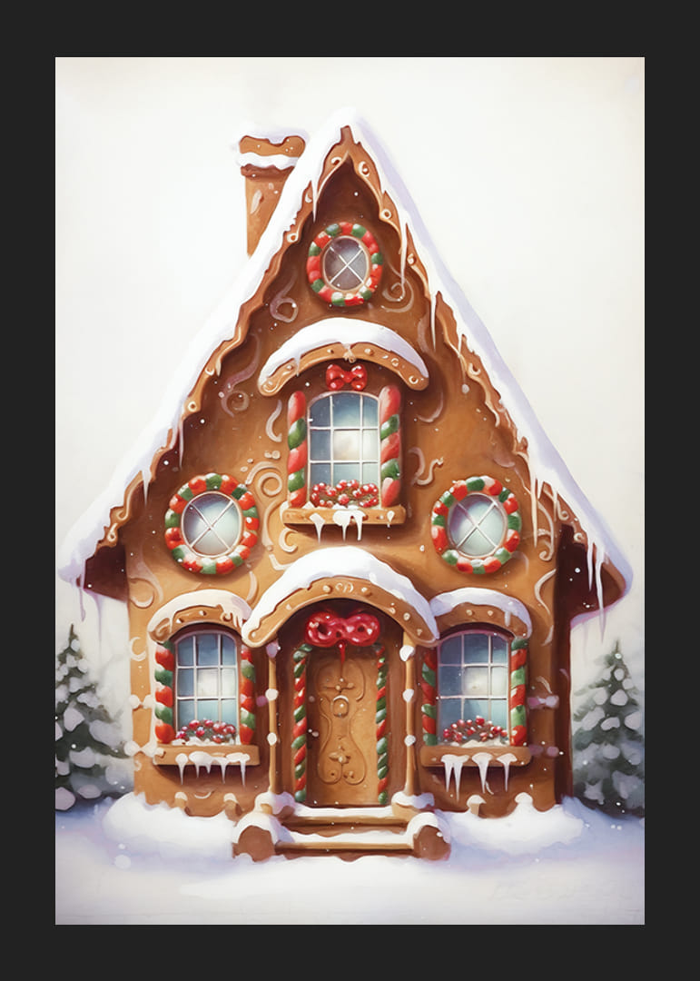 Perníková chalúpka so špicatou strechou, mrazivými oknami a zasneženými detailmi je ústredným bodom. Fasádu zdobia vence a pruhované cukrové palice, zatiaľ čo zo stropu visia biele cencúle. Z oboch strán dom obklopujú zelené jedle. Atmosférický plagát, ktorý prináša vianočnú atmosféru do detských izieb aj obývacích izieb.