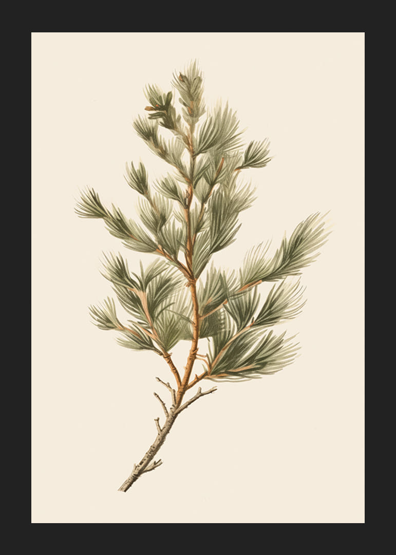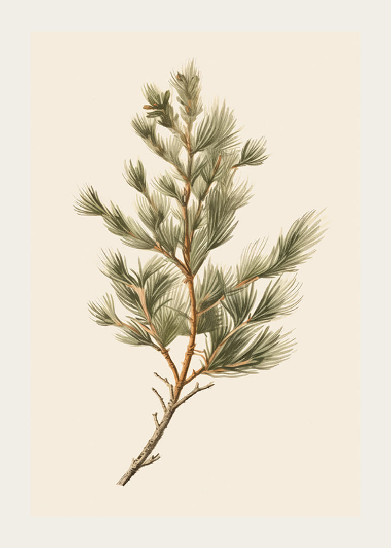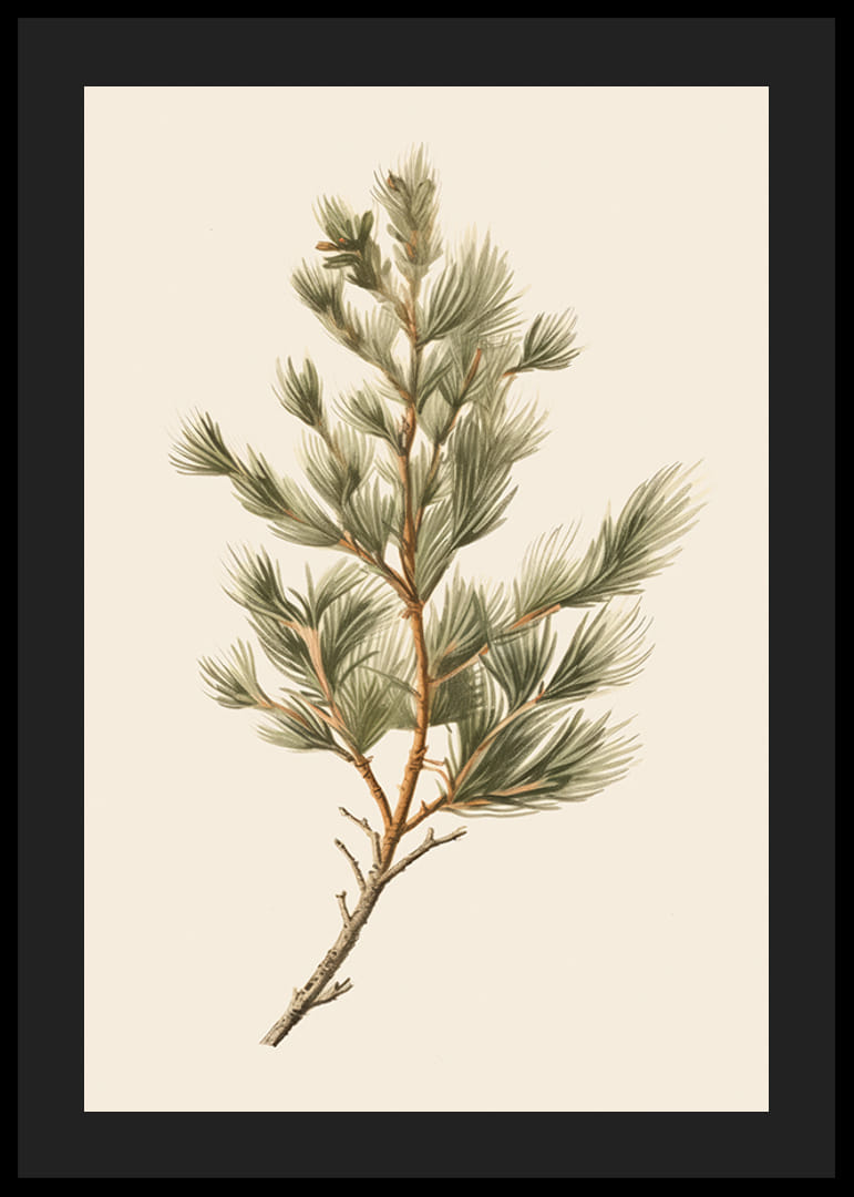 Motív pozostáva z detailnej ilustrácie zelenej borovicovej vetvy s ihličím rozprestierajúcim sa rôznymi smermi na jemnom, svetlobéžovom pozadí. Jemné odtiene zelenej a hnedej dodávajú prirodzený vzhľad. Tento plagát je ideálny do zimných alebo vianočných izieb, kde sú žiaduce botanické prvky.