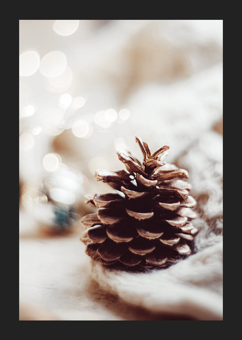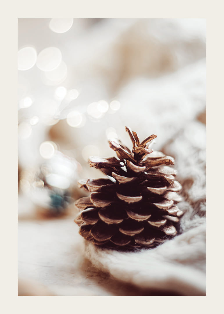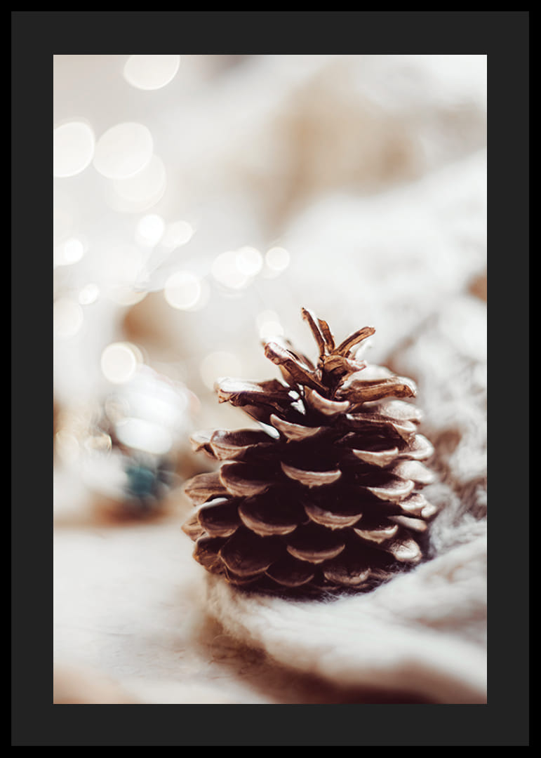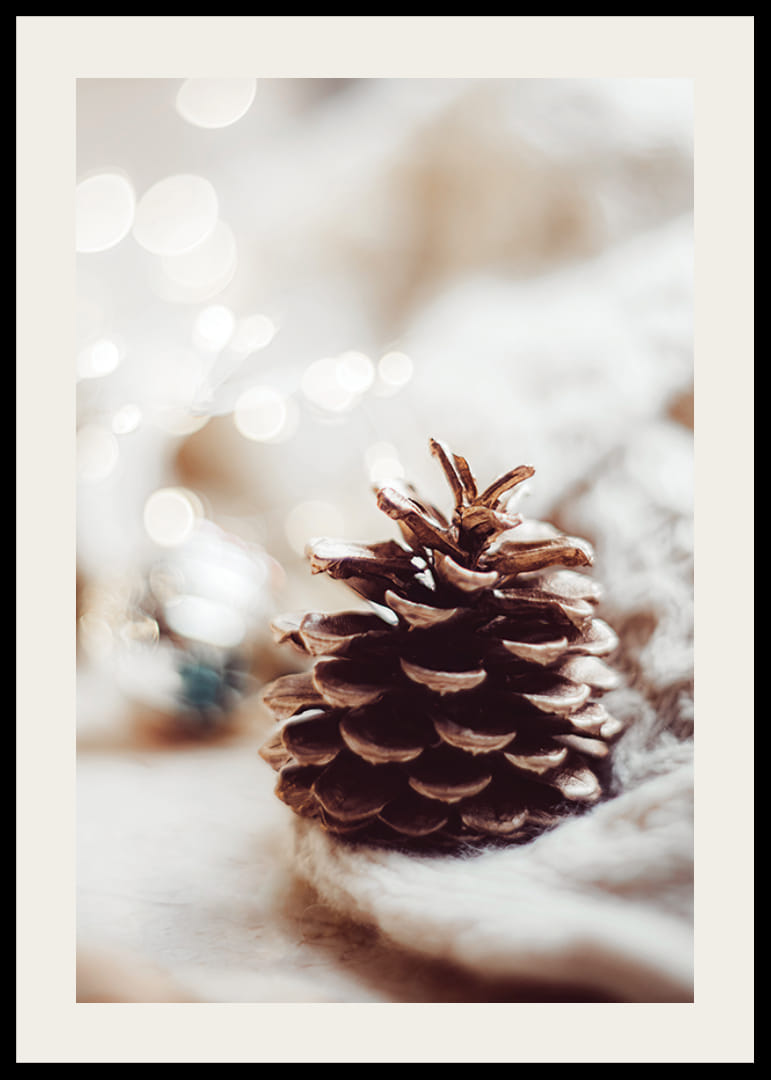 Detailne vytvorená šiška leží na mäkkom, pletenom povrchu s teplými, rozmazanými svetelnými bodmi v pozadí, čo vytvára pocit zimy a Vianoc. Motívu dominujú neutrálne béžové a hnedé tóny. Tento plagát sa skvele hodí do domácností, ktoré chcú počas sviatkov umocniť jemnú a atmosférickú zimnú atmosféru.