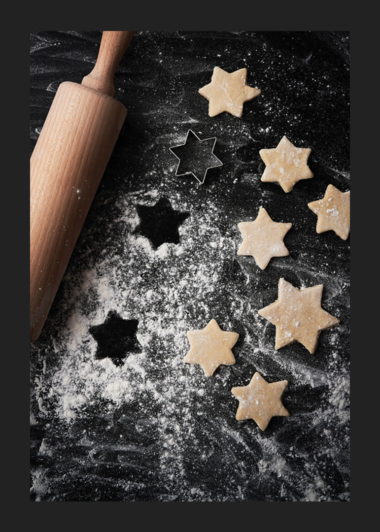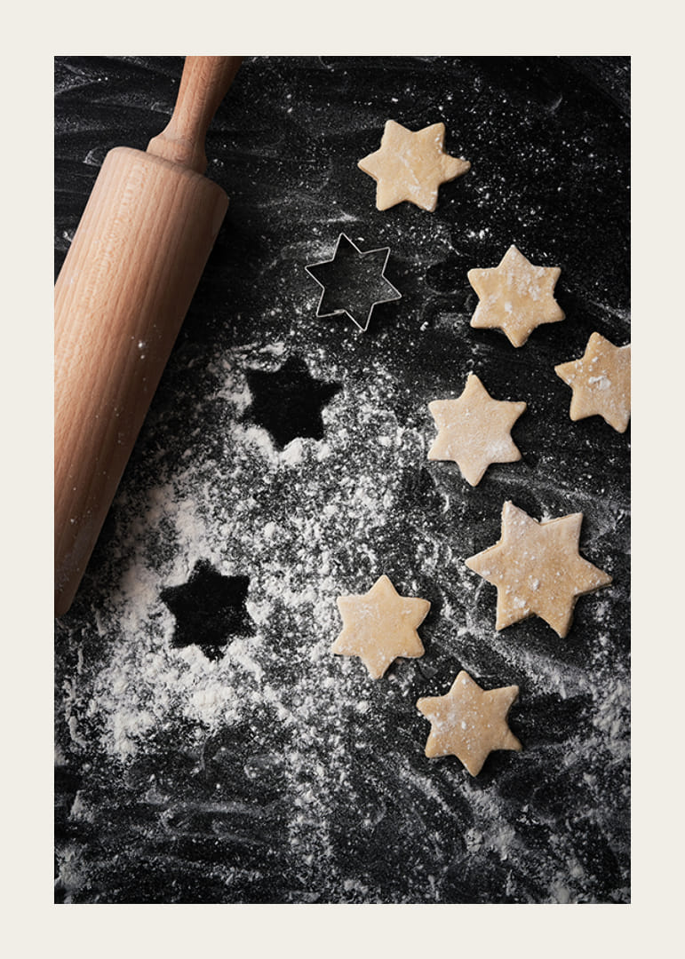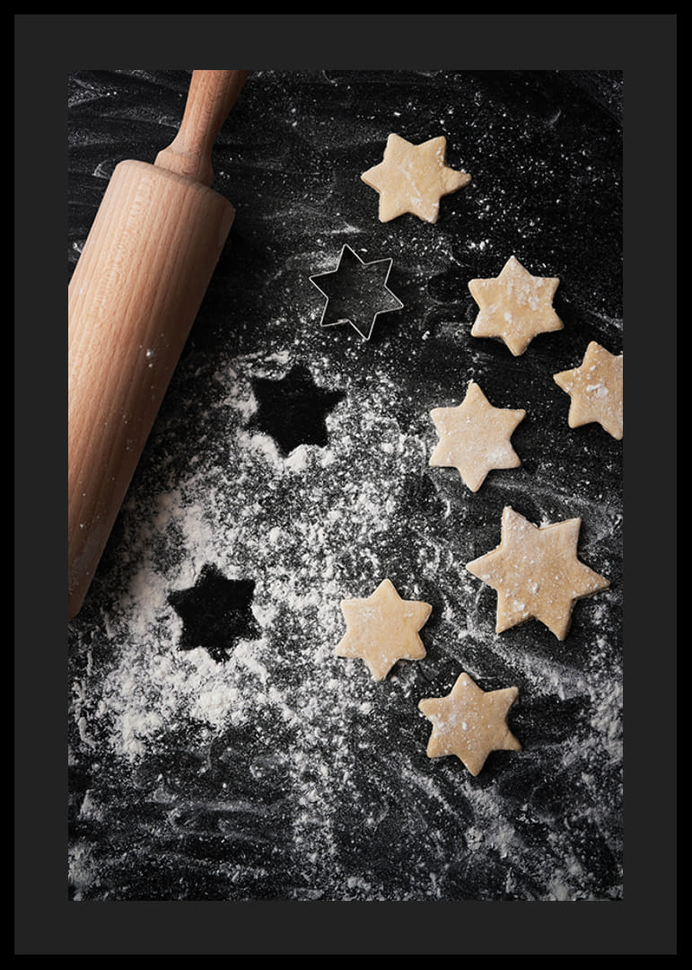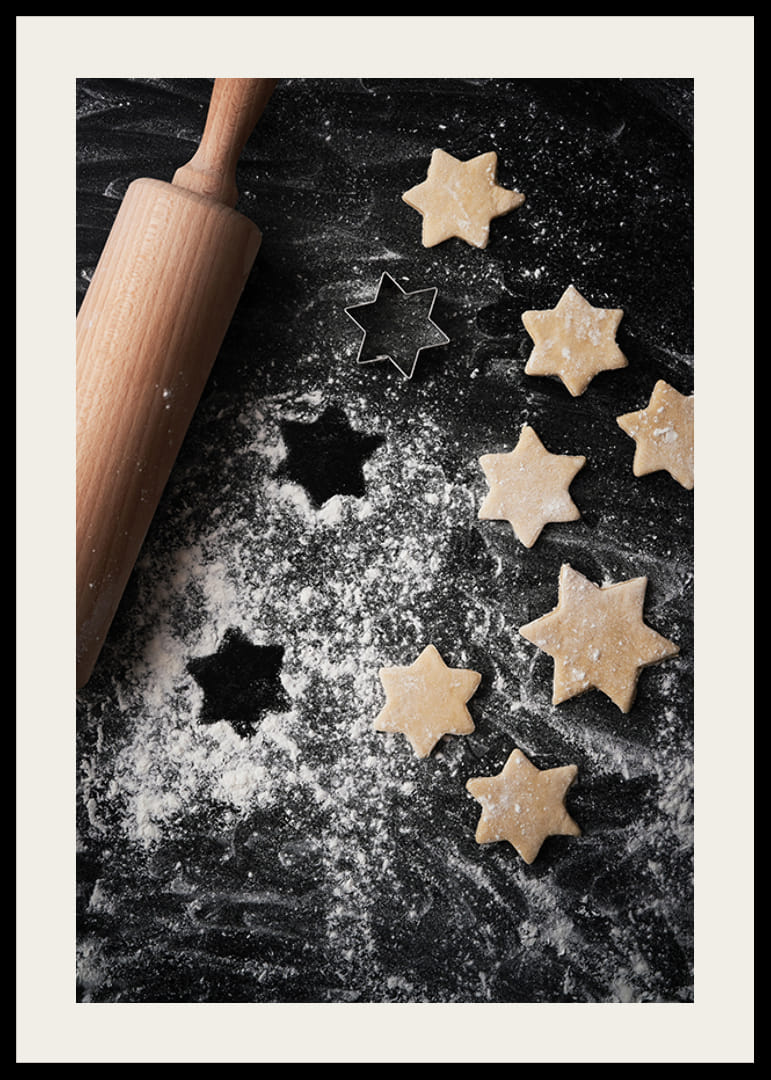 Perníkové sušienky v tvare hviezdy a valček ležia na tmavom, pomúčenom plechu na pečenie. Vykrojené kúsky cesta a kovová forma vytvárajú výrazne vianočnú atmosféru, zatiaľ čo prášková múka umocňuje domácku atmosféru. Tento plagát dodáva kuchyni alebo jedálni teplý, tradičný nádych.