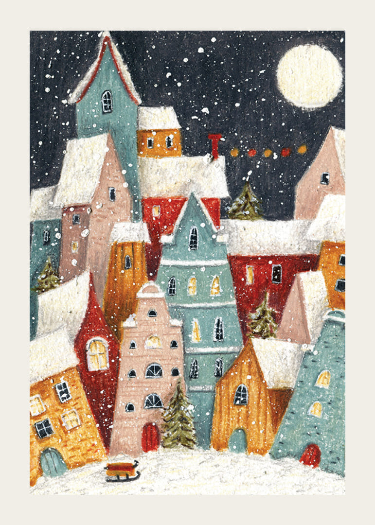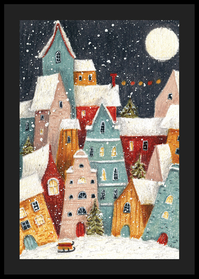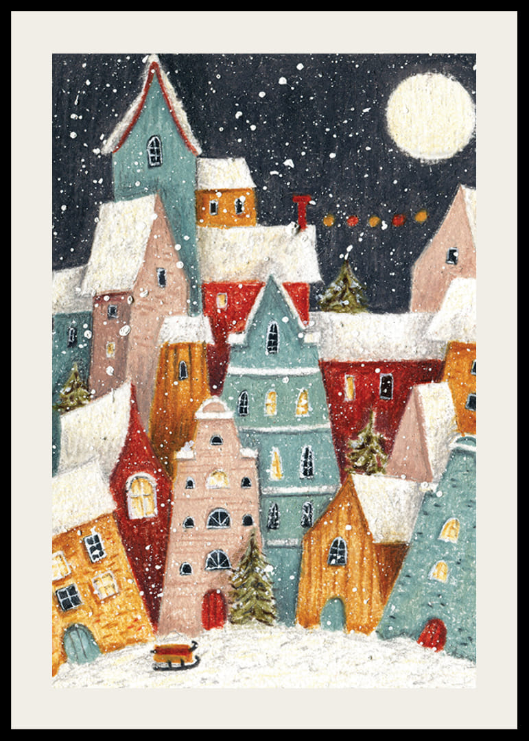 Viacfarebné domy so zasneženými strechami sa zhromažďujú blízko seba pod tmavou oblohou splnu a víriacimi snehovými vločkami. Malé okná teple žiaria, medzi budovami sú viditeľné jedle a v popredí stoja sane. Tento plagát vytvára hravú a zimnú atmosféru, ktorá je ideálna do chodby alebo detskej izby.