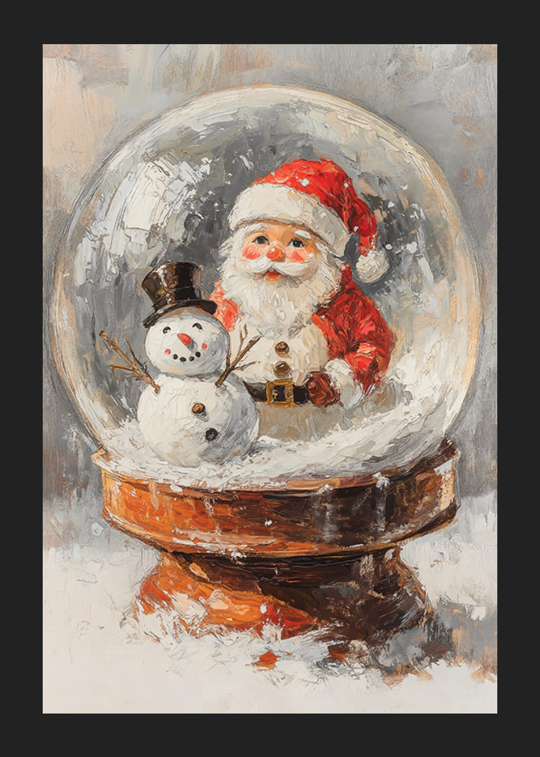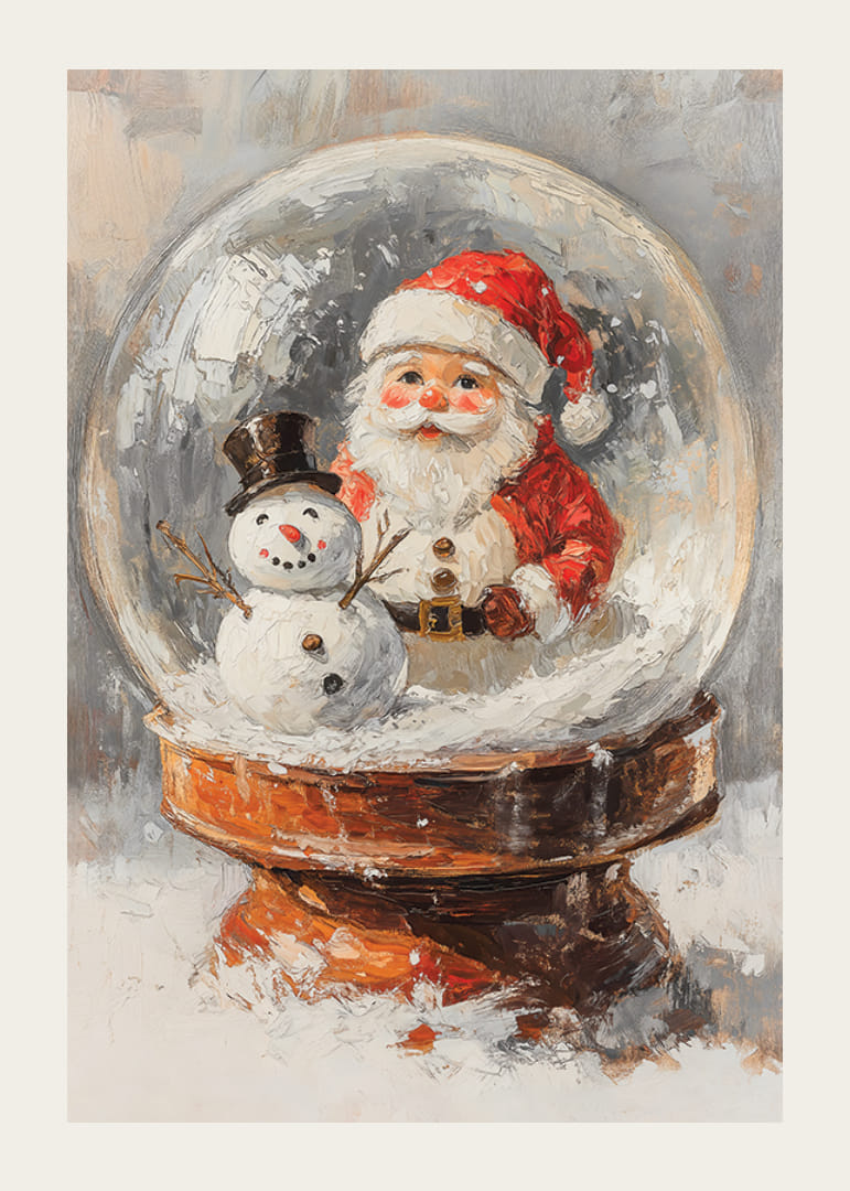 Motív pozostáva zo snehovej gule so Santa Clausom v červenom obleku vedľa snehuliaka s čiernou čiapkou a usmievavou tvárou. Pozadie je namaľované v jemných, neutrálnych tónoch, ktoré pôsobia pokojným dojmom. Pastelové ťahy štetcom a detaily vytvárajú príjemnú atmosféru. Tento plagát je rovnako vhodný do obývacích izieb ako aj do detských izieb počas Vianoc.