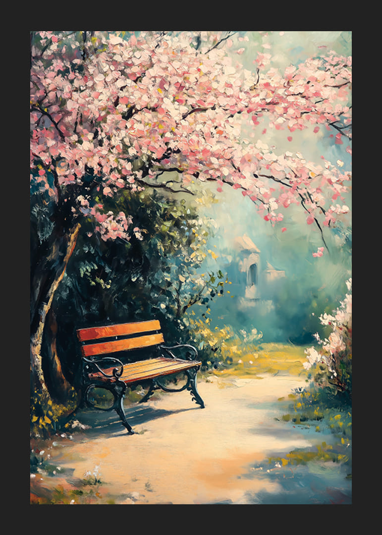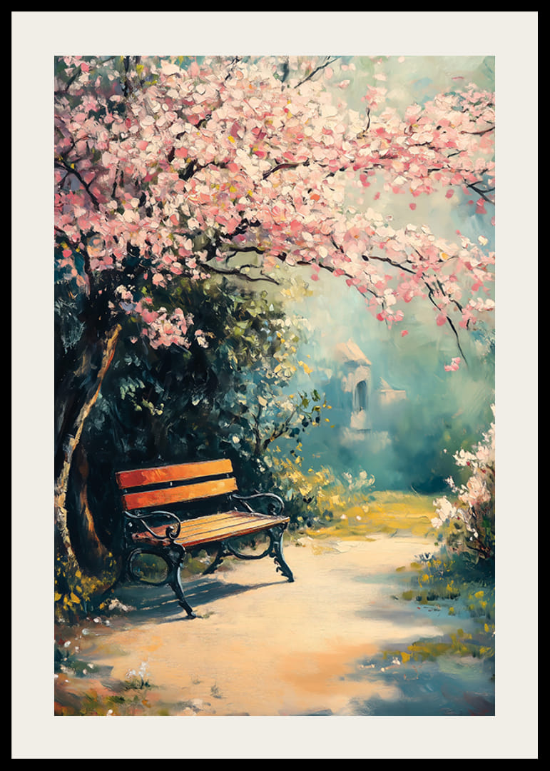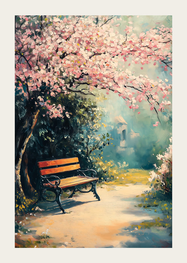 Pod bujnou čerešňou plnou ružových kvetov stojí pokojná lavička v parku, obklopená zeleňou a tlmeným slnečným svetlom presvitajúcim cez lístie. Jemné pastelové tóny a olejomaľba dodávajú motívu priateľský výraz. Plagát je vhodný do miestností, kde je túžená pokojná jarná atmosféra a prírodné prvky.