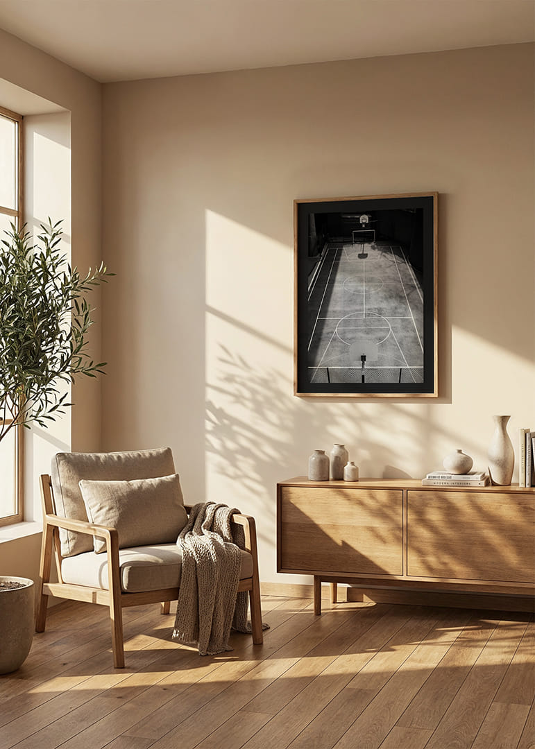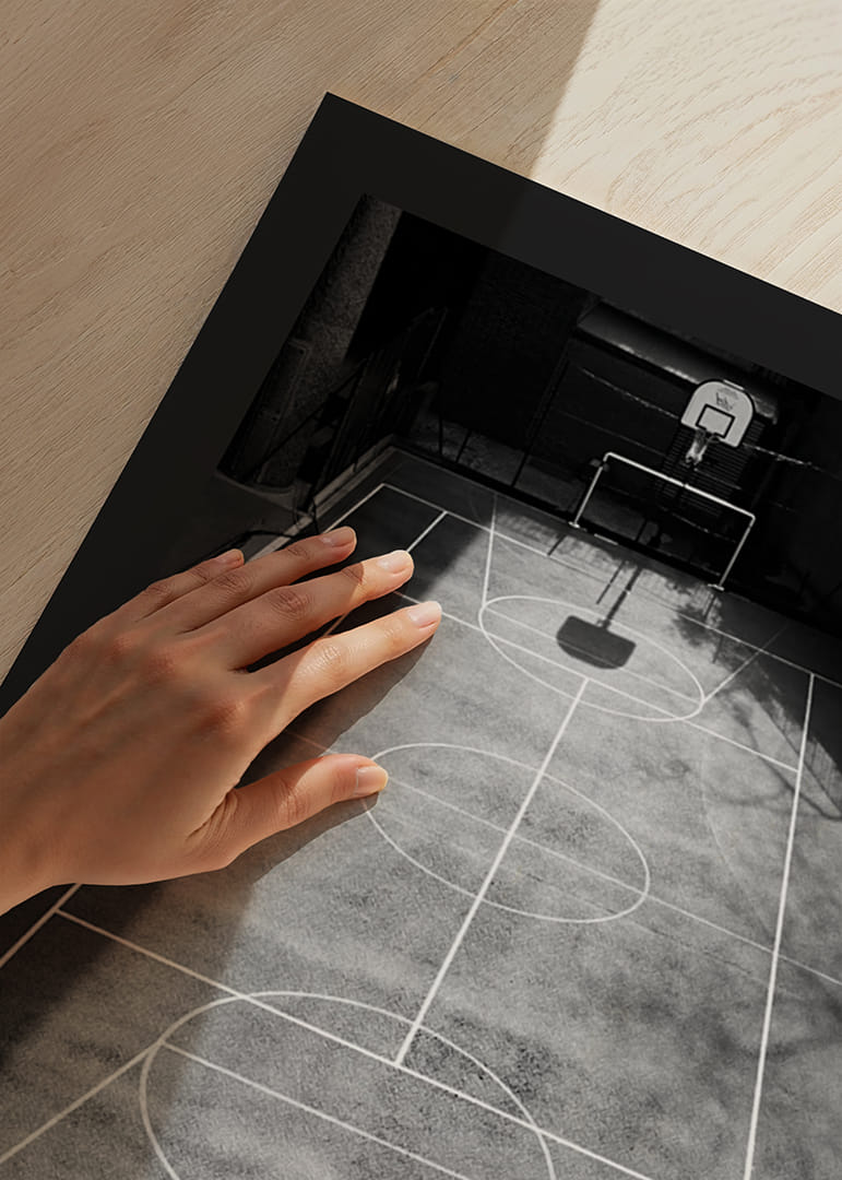 Textúrované basketbalové ihrisko v čiernobielej farbe, zachytené zhora s jasnými bielymi čiarami. Tiene okolitých budov vytvárajú zaujímavé kontrasty a hĺbku v objekte. Mestský nádych umocňuje odľahlé miesto. Plagát, ktorý sa hodí do športového interiéru moderného domu.