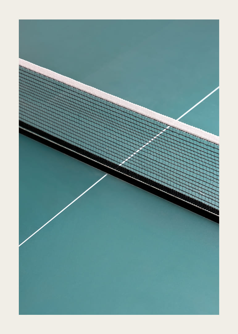 Čisté línie a grafický minimalizmus charakterizujú tento plagát s detailným záberom pingpongového stola v sýtozelenej farbe. Čierna sieť vyniká na matnom povrchu a biele čiary vytvárajú vyváženú kompozíciu. Tento plagát je vhodný do tínedžerskej izby, domácej posilňovne alebo kancelárie, kde je potrebná energia a jednoduchosť.