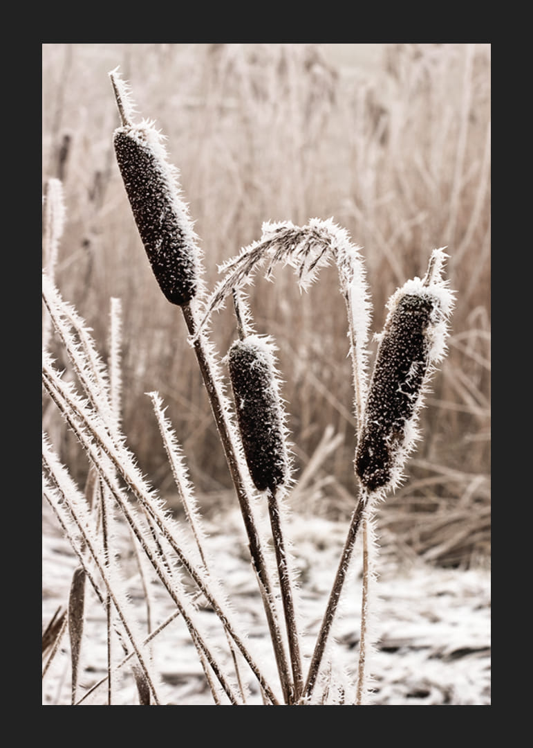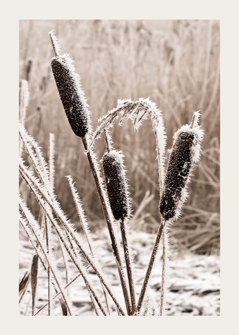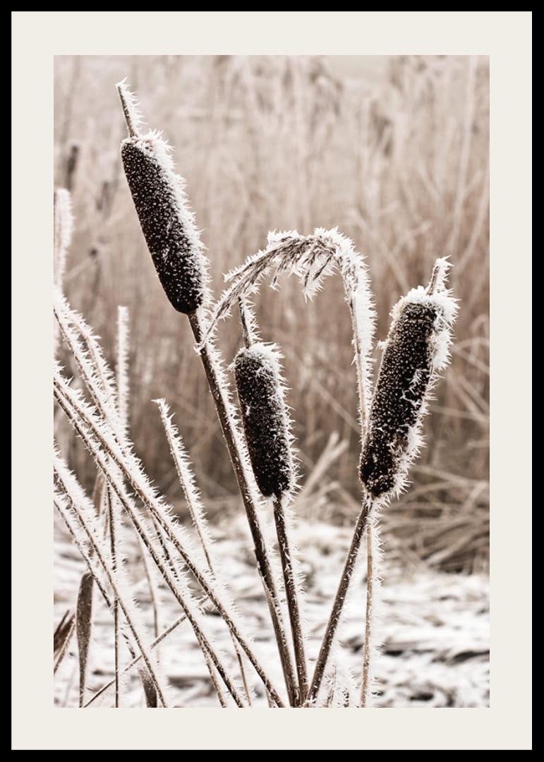 V svetle reflektorov vynikajú topole pokryté mrazom s charakteristickými hnedými klasmi pokrytými bielymi ľadovými kryštálmi. Pozadie je jemne rozmazané v béžových a sivých tónoch, čím sa zvýrazňuje štruktúra rastlín. Tento realistický plagát je ideálny do miestností, kde je túžené navodiť pokojnú zimnú atmosféru, ako je obývačka alebo chodba.