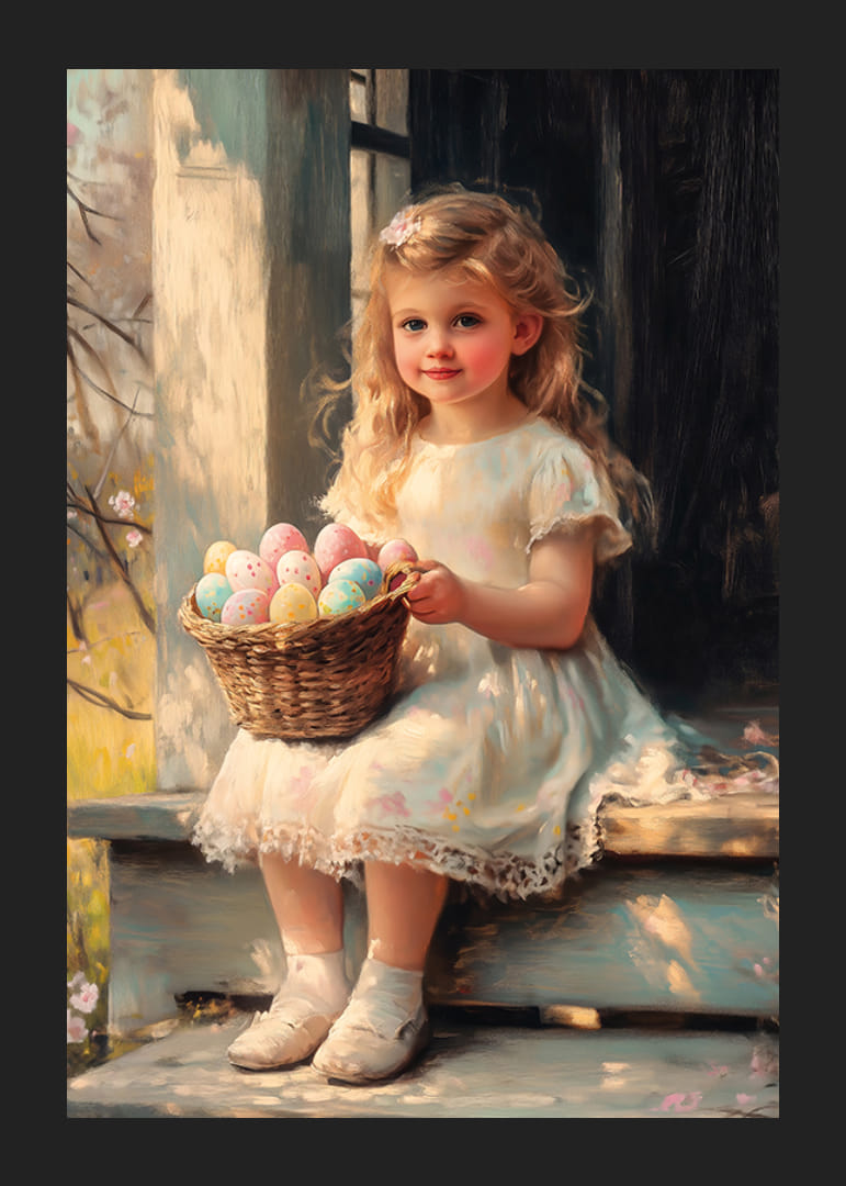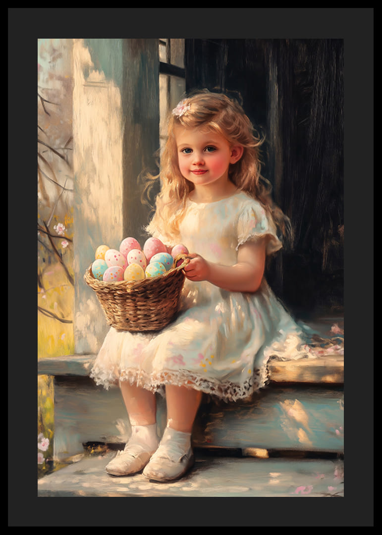 Blondínka v bielych šatách sedí na slnkom zaliatom schodisku a drží prútený košík plný pastelových veľkonočných vajíčok. Štýl pripomínajúci olejomaľbu vytvára jemné svetelné efekty a hrejivú atmosféru. Vďaka hravému a tradičnému motívu je tento plagát vhodný do detských izieb aj obývacích priestorov na jarnú výzdobu.