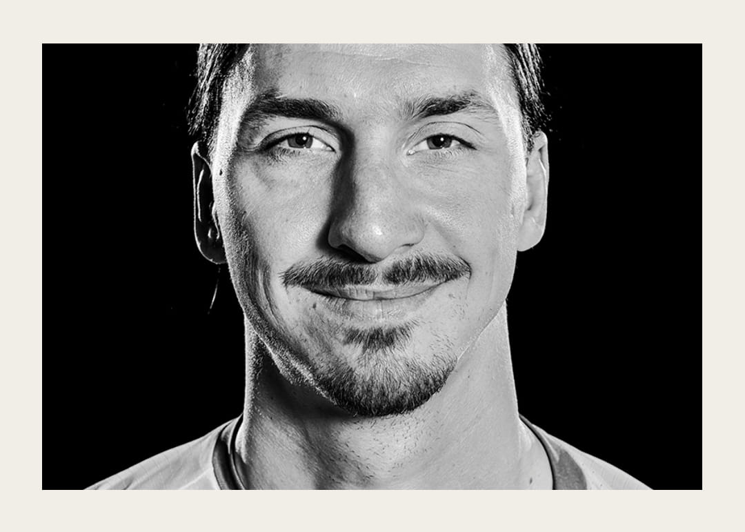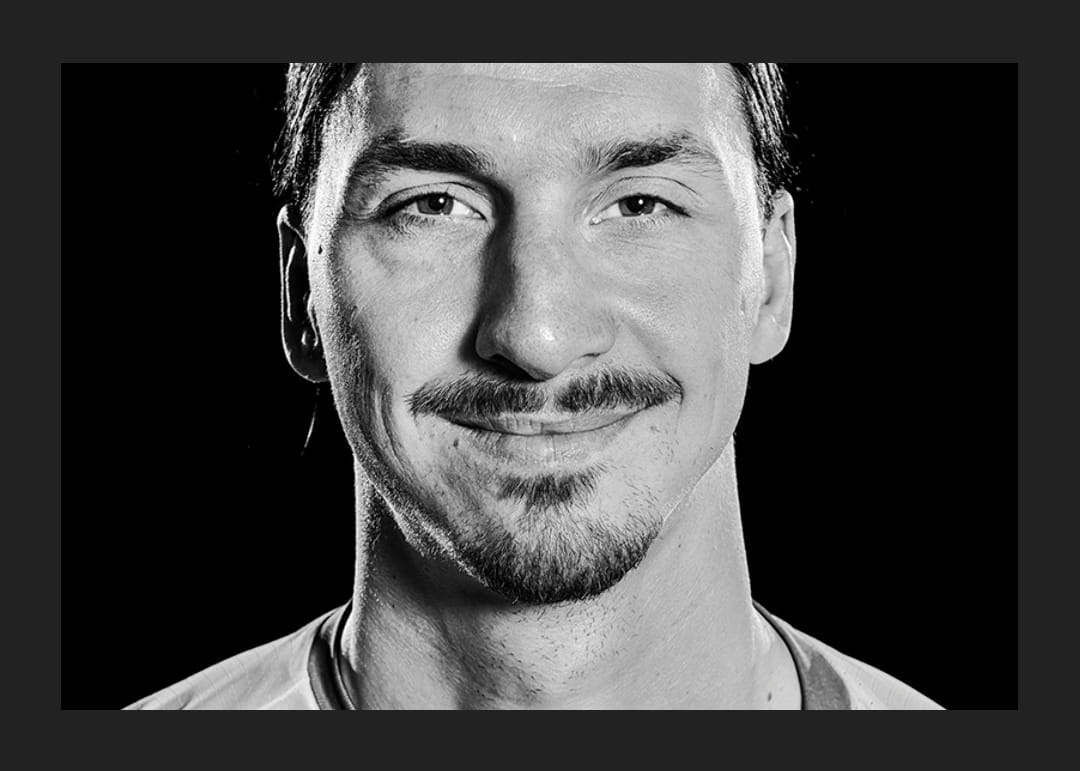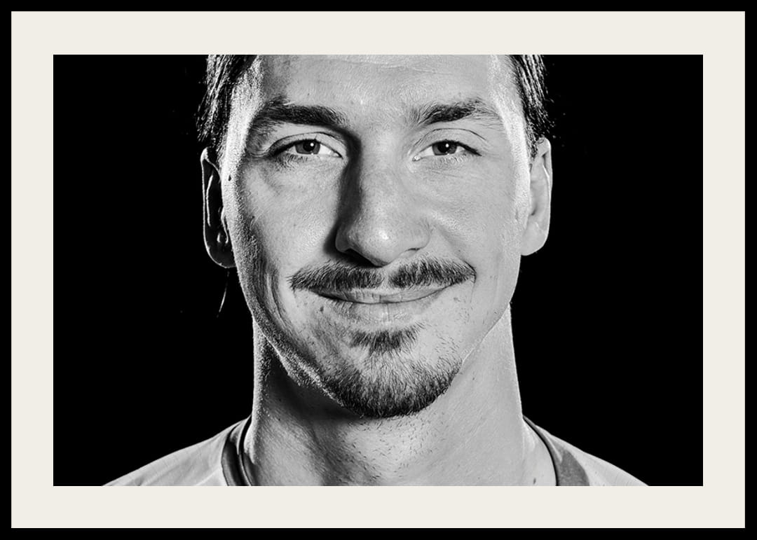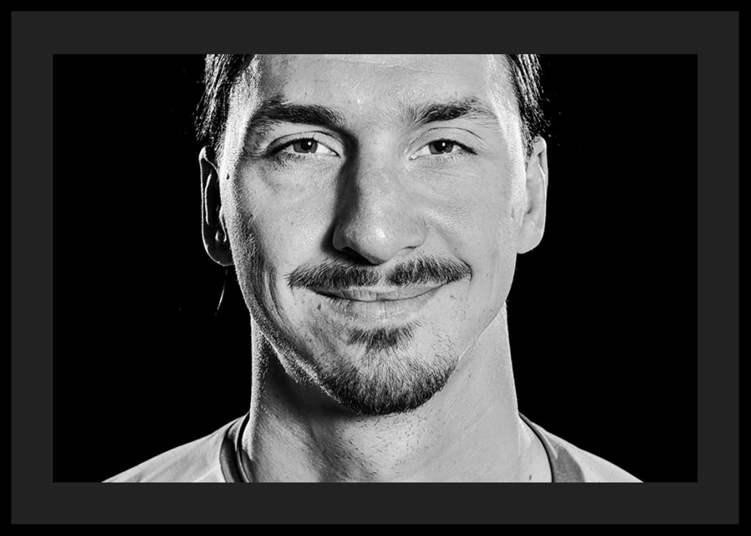 Čiernobiely plagát s portrétnou fotografiou švédskeho futbalistu Zlatana Ibrahimoviča z roku 2016.