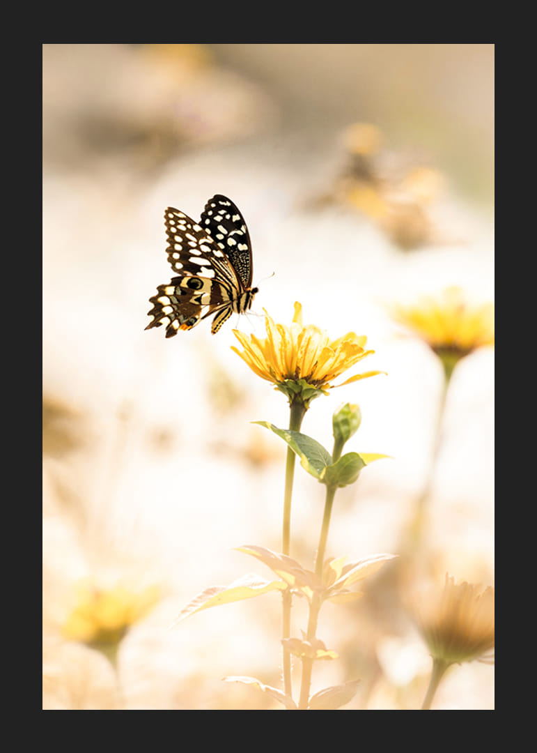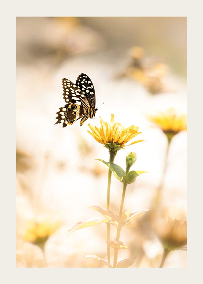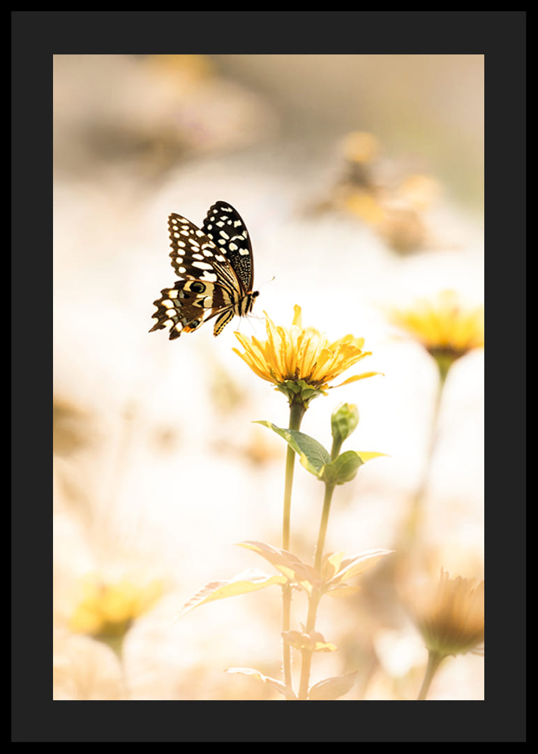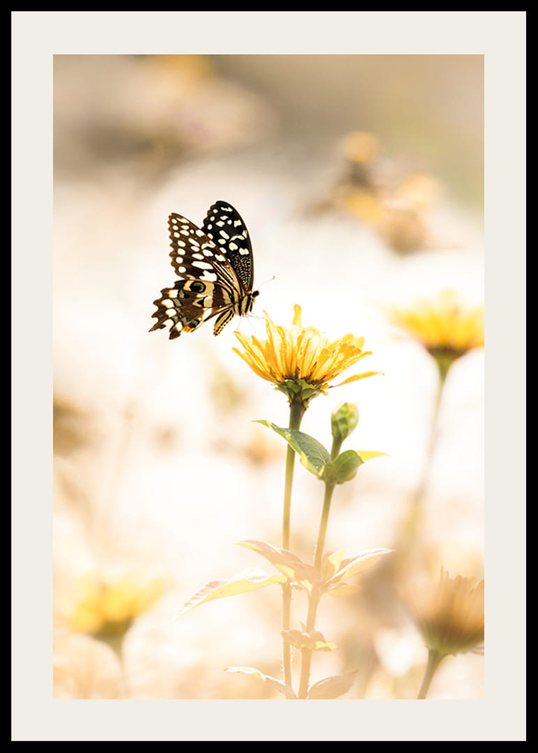 Rozžiarte svoj domov týmto krásnym plagátom, ktorý zachytáva moment elegancie motýľa, ktorý sa vznáša nad žltým kvetom. Jemné osvetlenie a jemné farby vytvárajú pokojnú a pokojnú atmosféru. Ideálne na to, aby váš interiér dostal nádych krásy prírody.