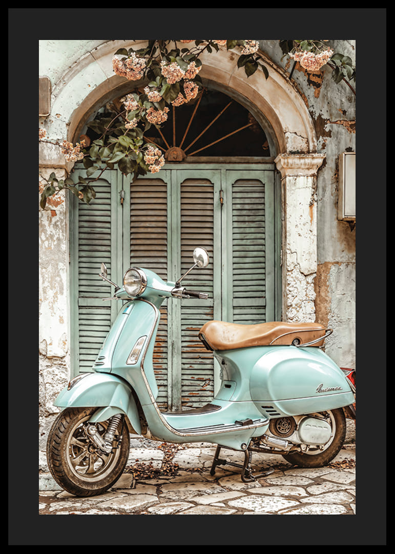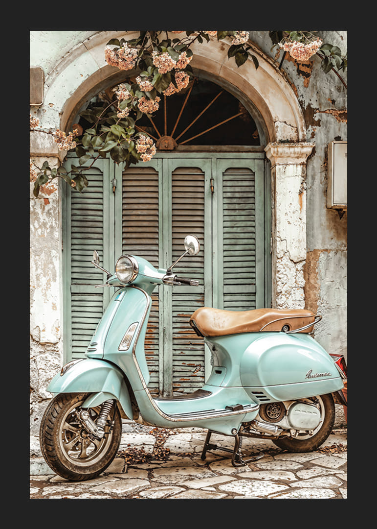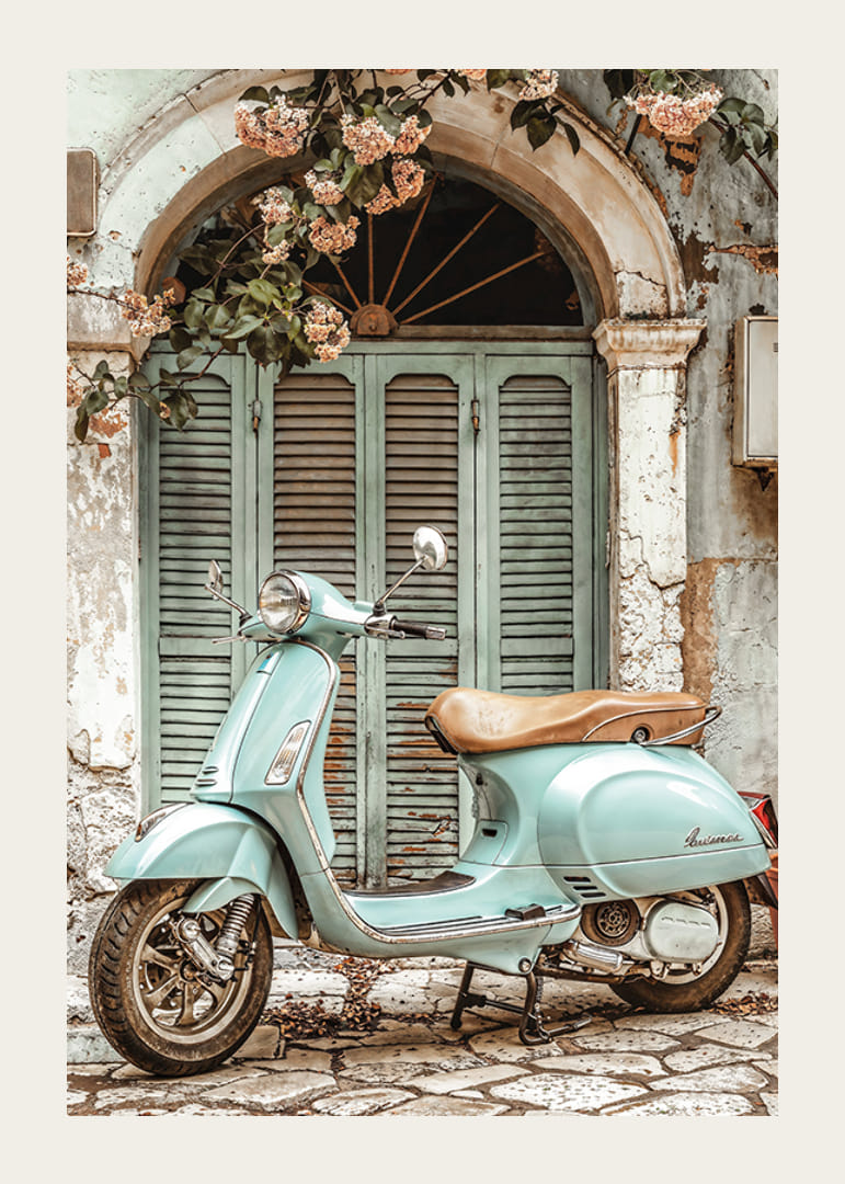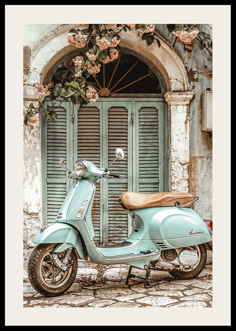 Zachyťte podstatu talianskeho šarmu s naším očarujúcim plagátom zobrazujúcim mätovo zelenú vespu pred malebnými starými dverami s prekvitajúcimi viničmi. Táto nostalgická scéna vyžaruje zmysel pre romantiku a dobrodružstvo a je ideálna na dodanie nadčasovej krásy do vášho domova alebo kancelárie. So svojou jemnou farebnou paletou a vintage nádychom je tento plagát pútavým doplnkom, ktorý evokuje sny o slnečných dňoch a kľukatých uličkách v pôvabnej talianskej dedine.