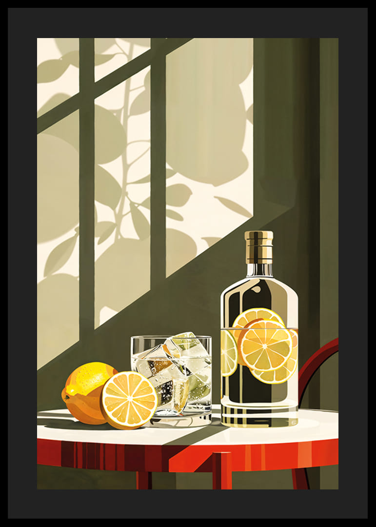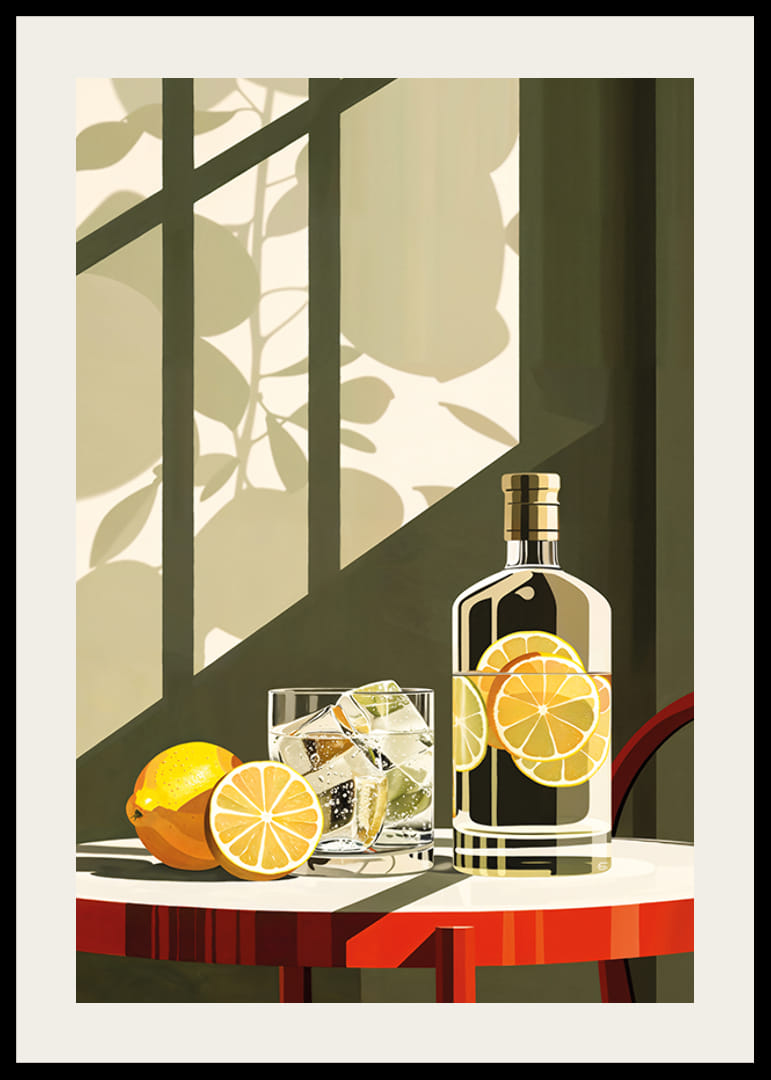 Tento plagát zachytáva slnečný moment jednoduchej elegancie, kde je na stole fľaša ginu, pohár s ľadom a citrónom a čerstvý citrón. Slnečné lúče vrhajú krásne tiene lístia na stenu za nimi a vytvárajú pokojnú a príjemnú tieňohru. Sýto zelené pozadie a teplé žlté tóny citrónu dodávajú obrázku svieži a prirodzený pocit. Ideálne na dodanie letnej elegancie do vašej kuchyne alebo obývačky a zachytenie pocitu relaxačného popoludnia na slnku.
