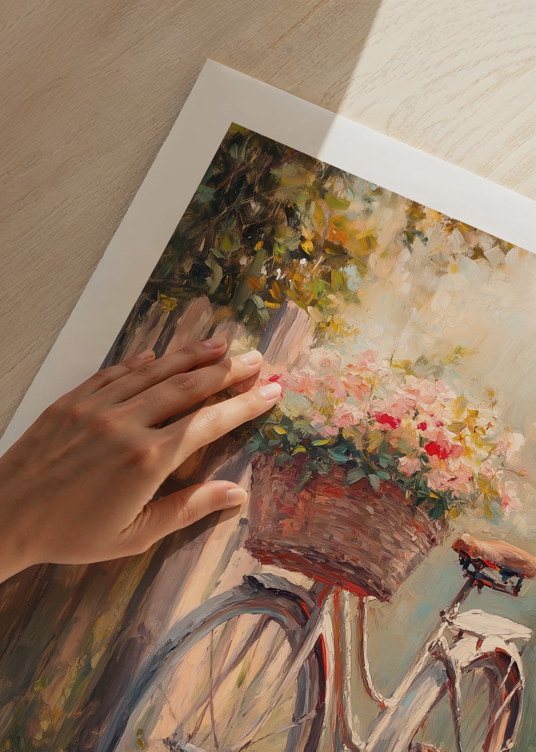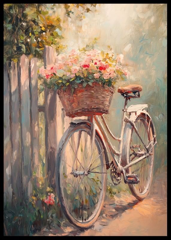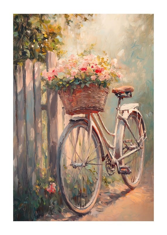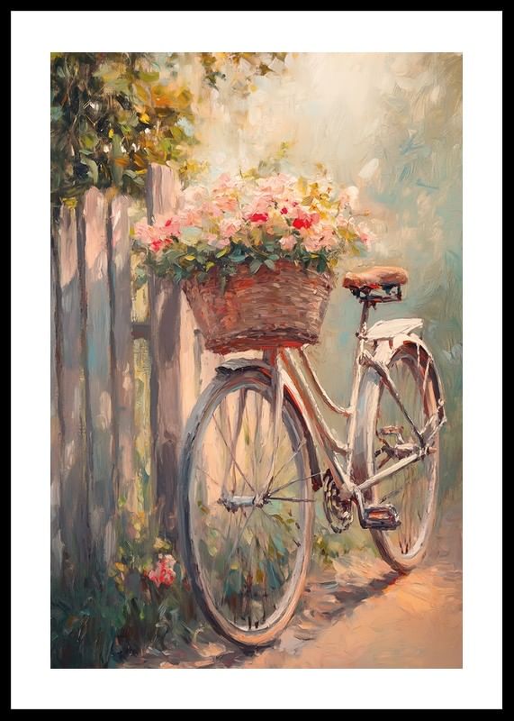 Vytvorte pocit nostalgie a šarmu s týmto plagátom zobrazujúcim vintage bicykel s prekvitajúcim košíkom opretý o drevený plot v mäkkom slnečnom svetle. S teplými farbami a romantickou atmosférou obraz zachytáva podstatu jednoduchých, krásnych chvíľ na vidieku. Ideálne na to, aby váš domov získal nádych rustikálnej elegancie a pripomenul si letné dni plné pokoja a radosti.