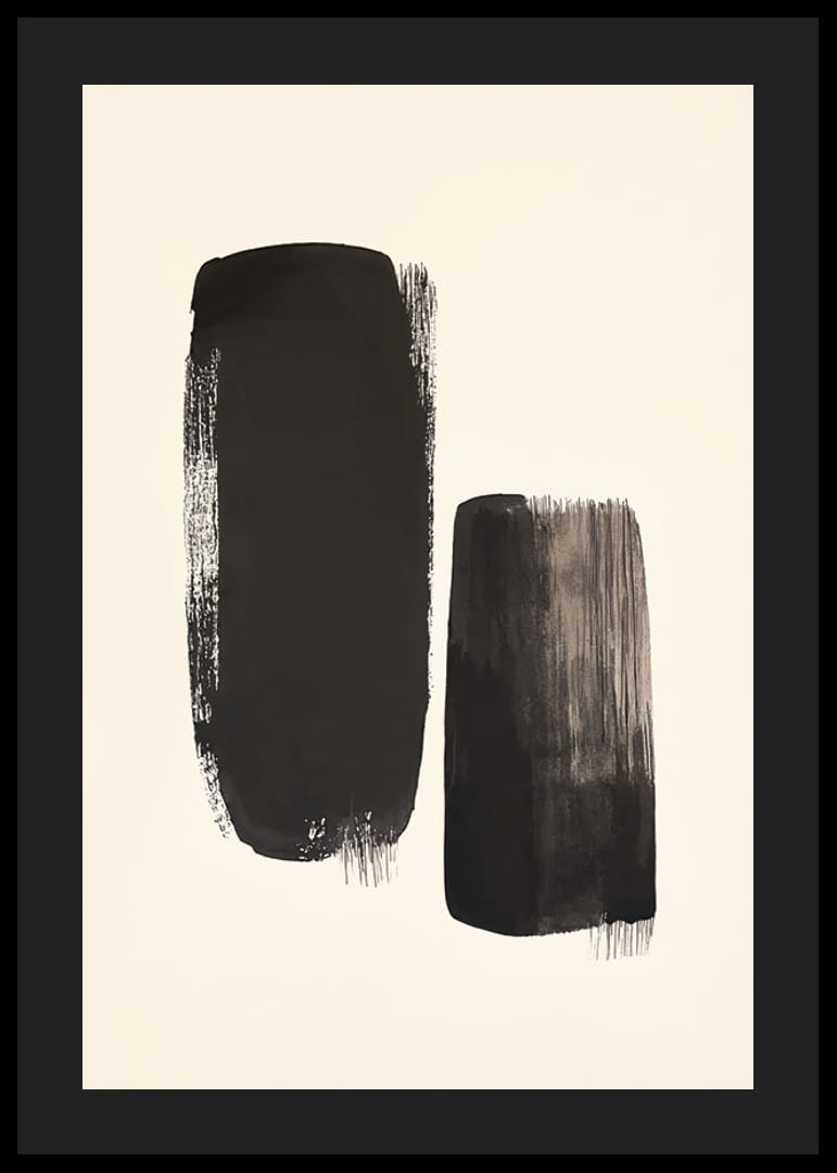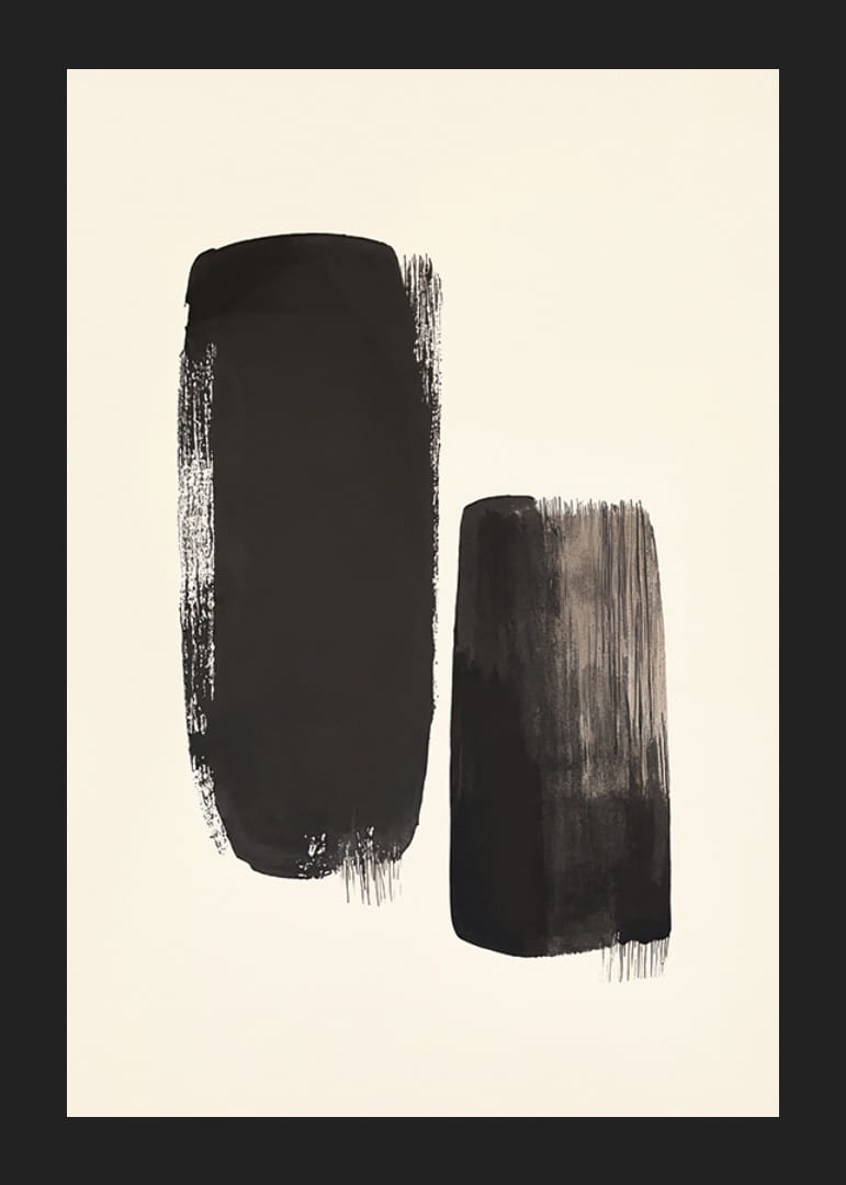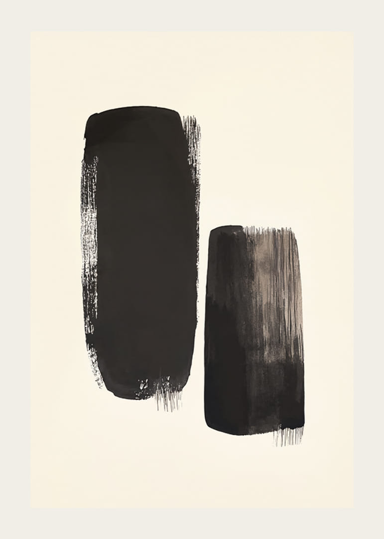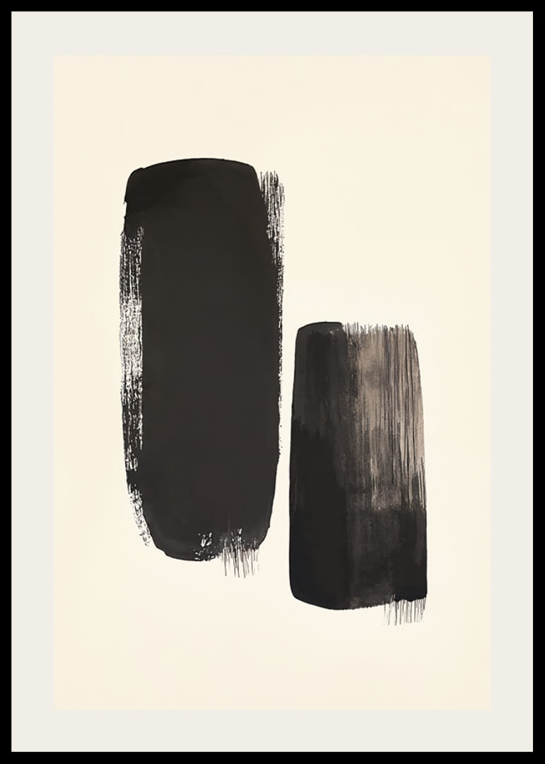 Tento minimalistický plagát zobrazuje dva tmavé ťahy štetcom na pozadí neutrálnej pieskovej farby. Silné ťahy štetcom poskytujú surový a abstraktný výraz, kde jeden tvar je vyšší a širší, zatiaľ čo druhý je užší a o niečo kratší. Kontrast medzi čiernou farbou a svetlým pozadím vytvára silný vizuálny efekt, ktorý upúta pozornosť diváka. Jednoduchá, ale dynamická kompozícia prináša pocit rovnováhy a pokoja, ideálne pre tých, ktorí hľadajú štýlové a moderné umelecké dielo pre svoj domov alebo kanceláriu.