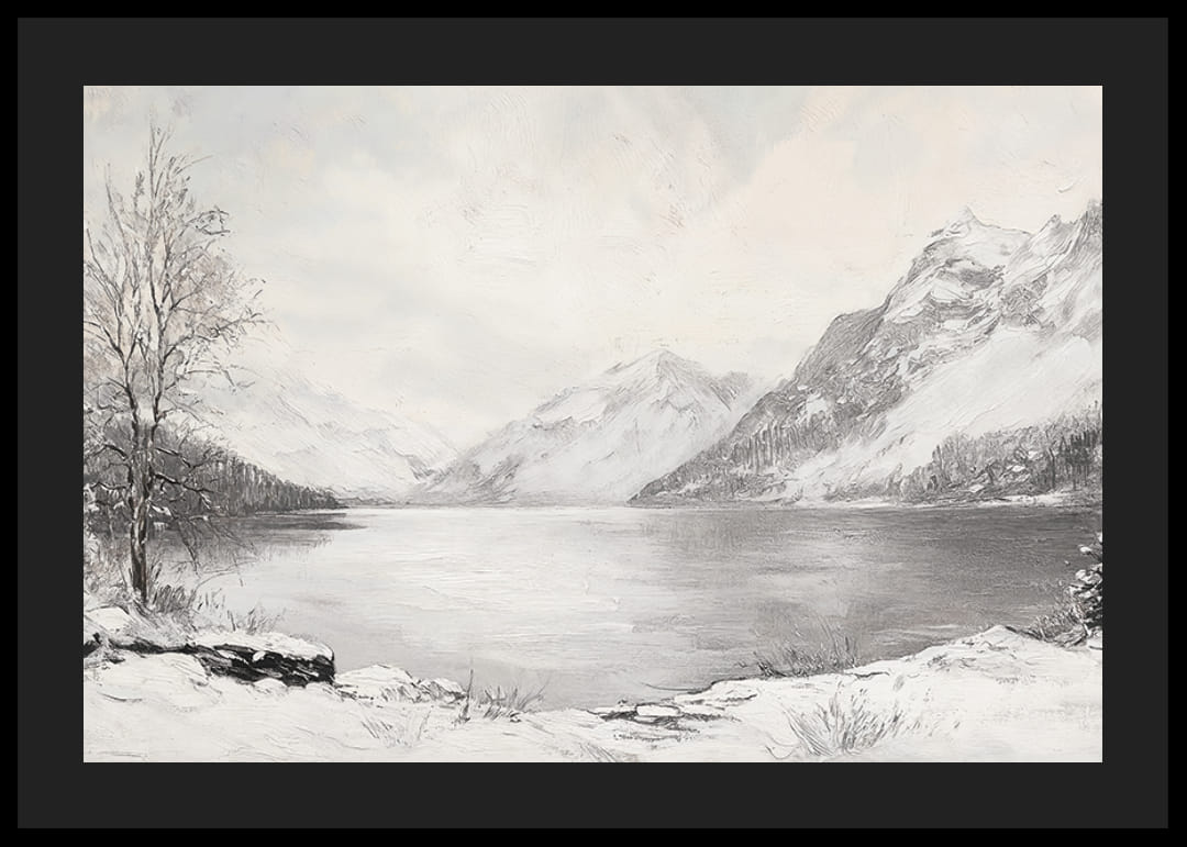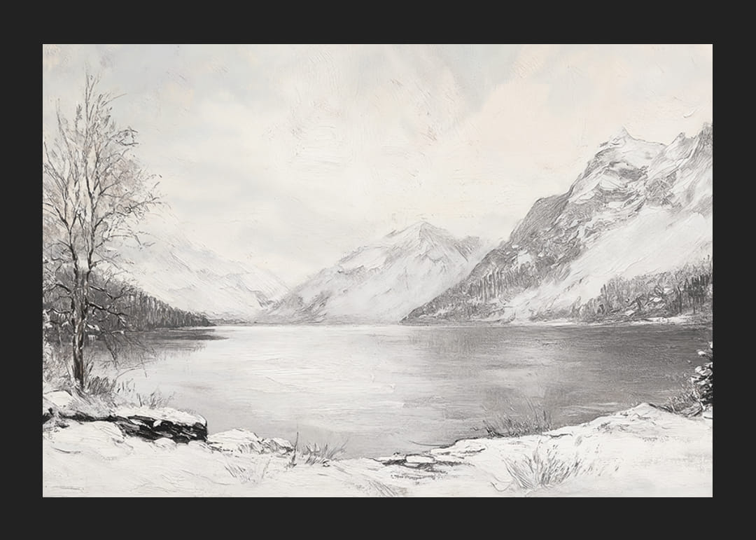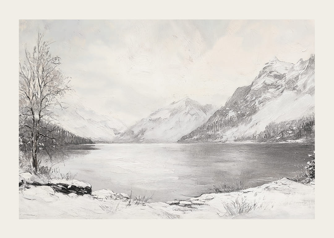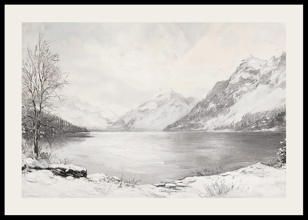 Naplňte svoj domov pokojnou a prírodnou krásou s týmto plagátom zobrazujúcim pokojný zimný deň pri jazere pripomínajúcom zrkadlo, obklopenom majestátnymi, zasneženými horami. Jemné odtiene a minimalistická kompozícia zachytáva nehybnosť a nadčasovosť zimnej krajiny. Ideálne na vytvorenie harmonickej atmosféry a pocitu pokojnej prírody