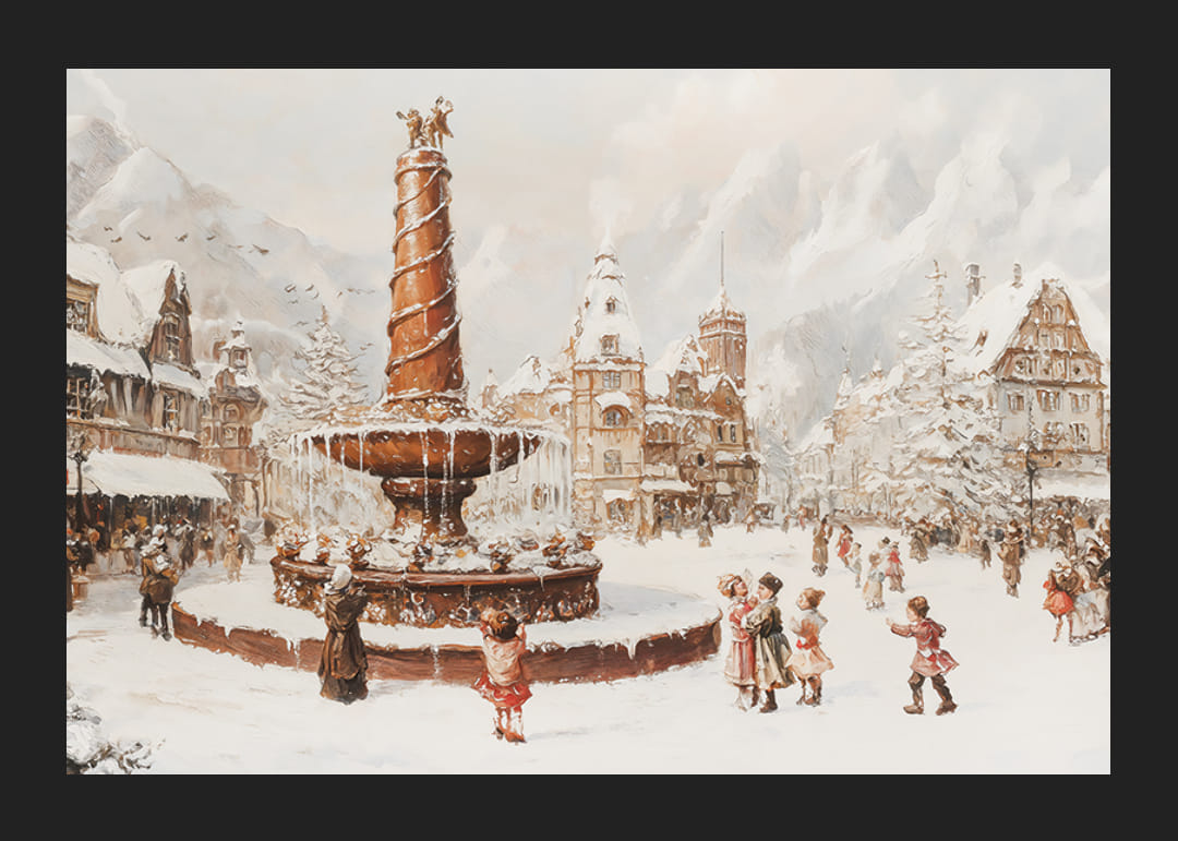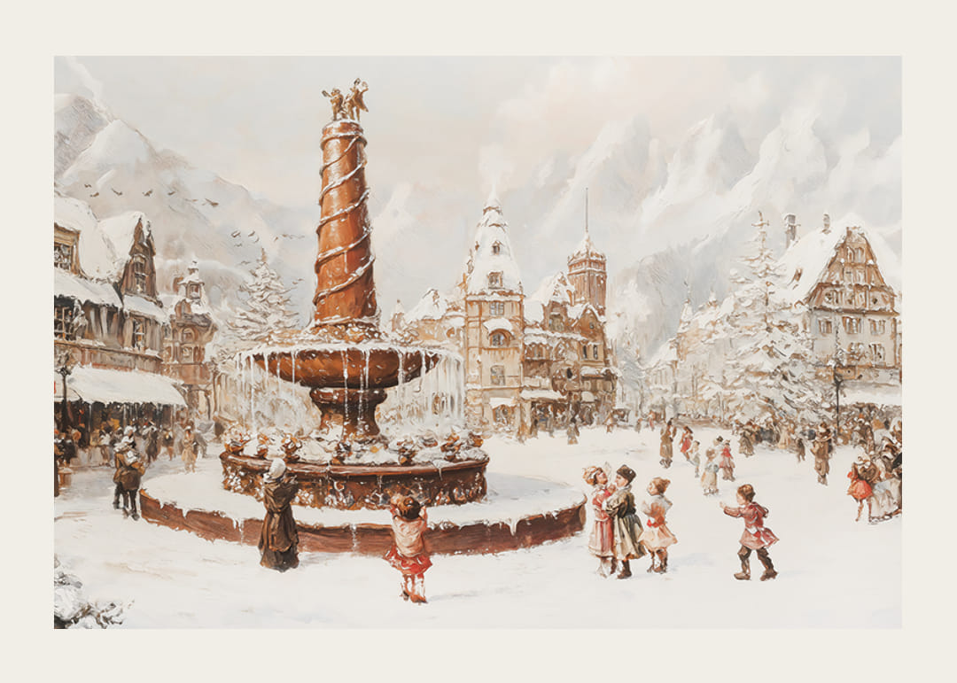 Zachyťte čaro zimy pomocou tohto plagátu zobrazujúceho živé dedinské námestie pokryté snehom, kde sa ľudia zhromažďujú okolo majestátnej fontány. Detailne prepracované stavby a sviatočná atmosféra dýchajú nostalgiou a vianočnou atmosférou. Perfektné ako dekorácia na vytvorenie teplého a príjemného pocitu alebo ako darček na šírenie zimnej nálady