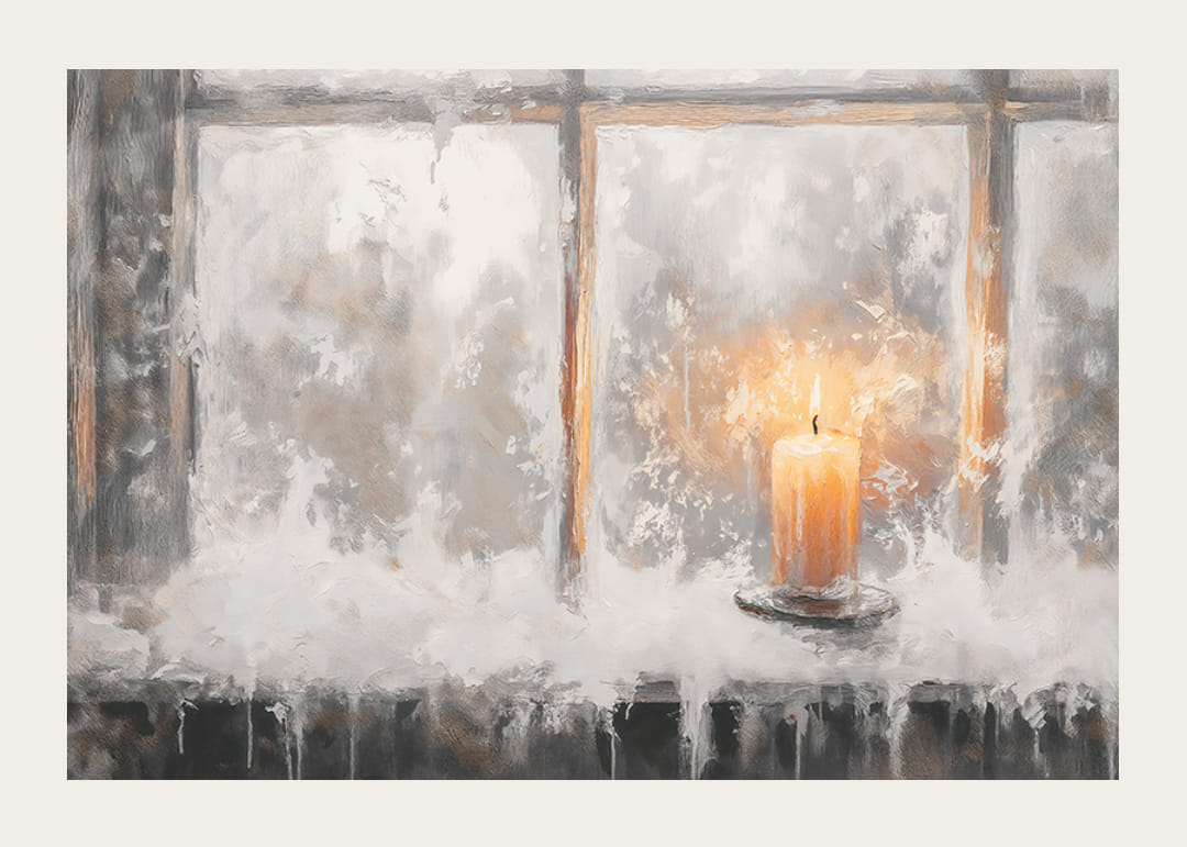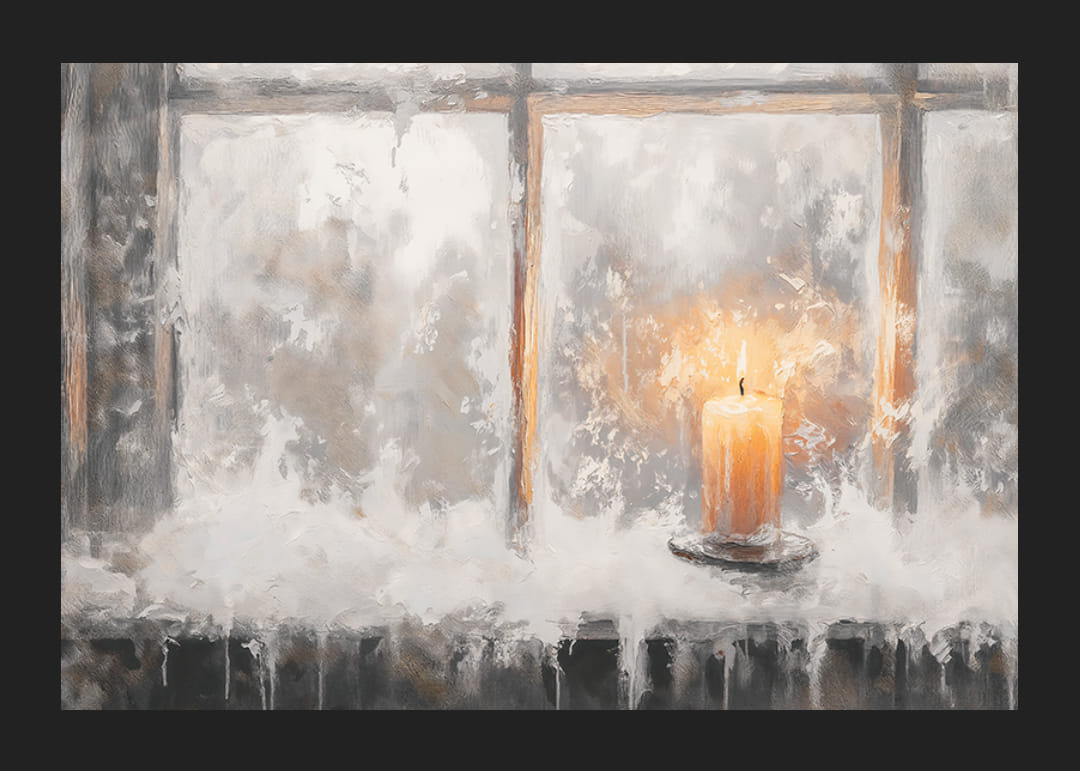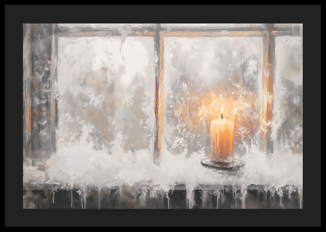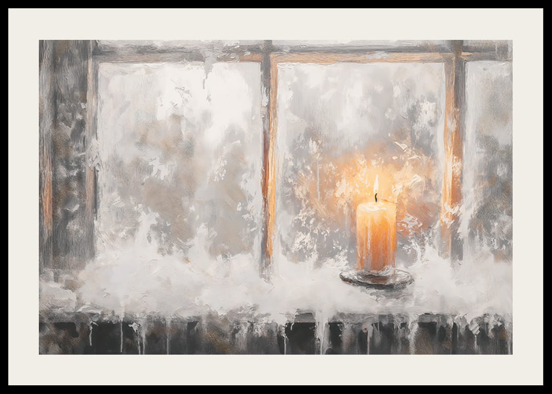 Vytvorte si pocit zimnej pohody s týmto atmosférickým plagátom! Obrázok zobrazuje mrazivé okno, kde osamelý teplý plameň zo sviečky osvetľuje chladnú zimnú krajinu vonku. Svetlo vytvára jemnú žiaru, ktorá kontrastuje s mrazivým skleneným povrchom a sprostredkúva pocit pokoja a tepla uprostred zimného chladu. Ideálne na poskytnutie útulnej a premyslenej atmosféry v najtemnejšom období roka.
