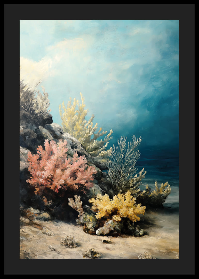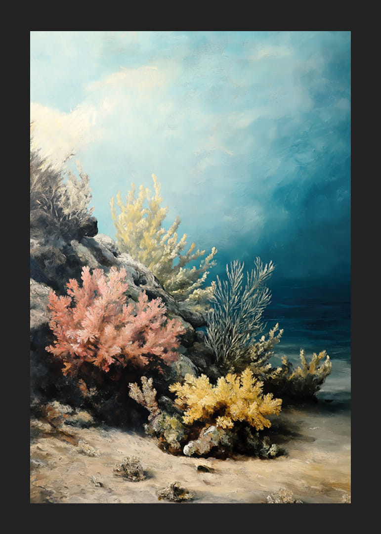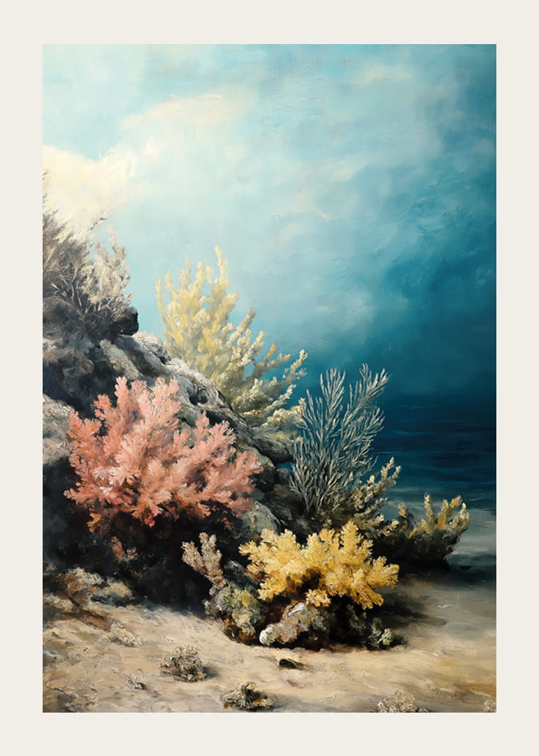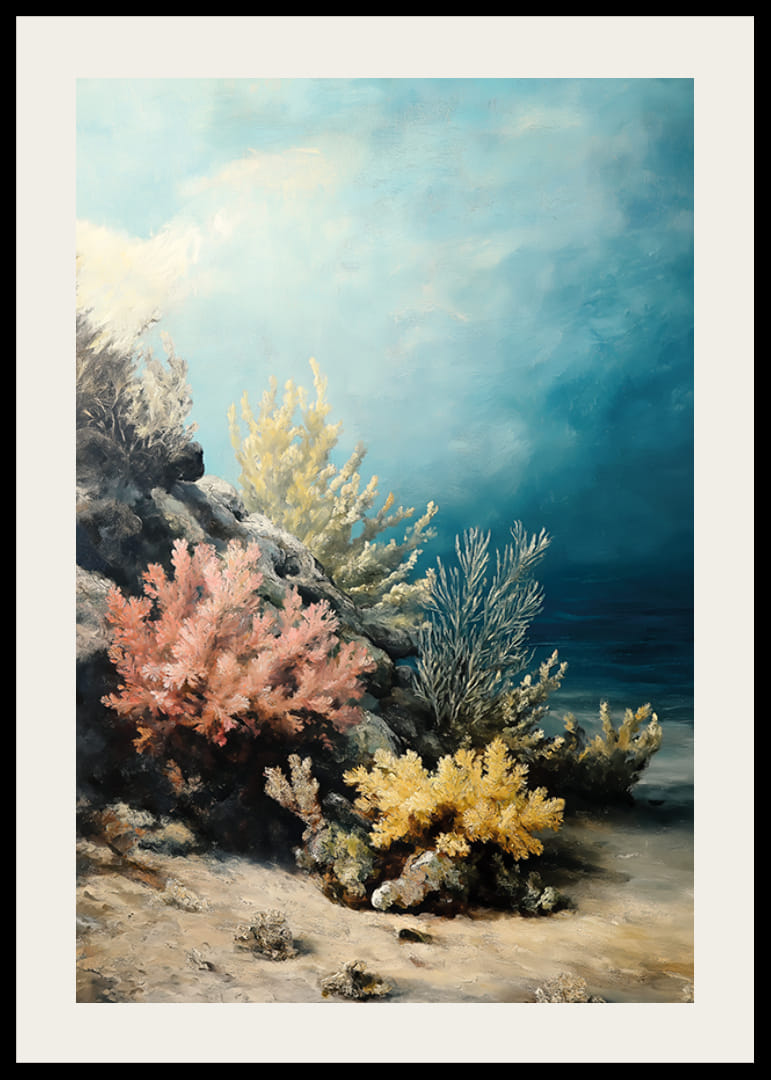 Ponorte sa do magického podmorského sveta s týmto plagátom, ktorý zachytáva farebné koraly v jemných odtieňoch ružovej, žltej a modrej. Krištáľovo čistá voda a tajomná hĺbka vytvárajú harmonickú a snovú atmosféru.