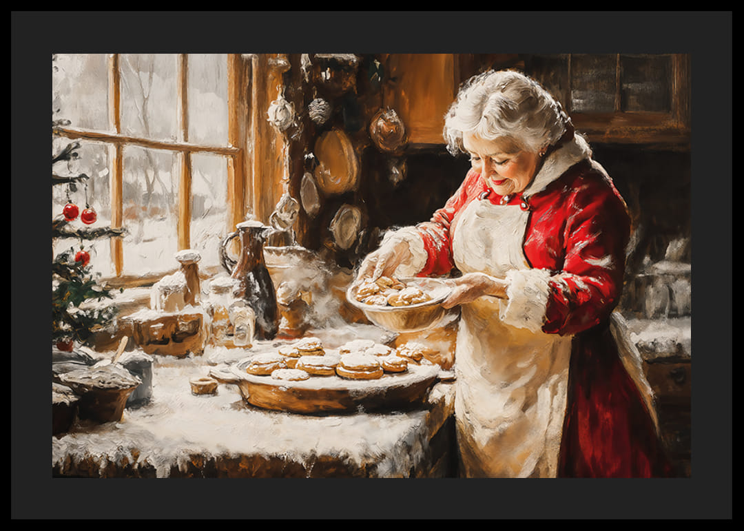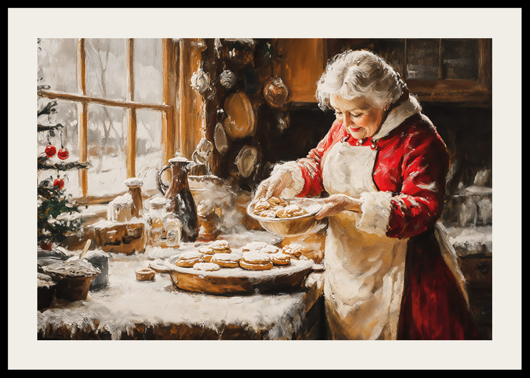 Zažite čaro Vianoc u vás doma s týmto očarujúcim plagátom! Na obrázku je milujúca staršia pani, oblečená ako pani Clausová, ako pečie koláčiky v teplej a útulnej kuchyni. Za oknom husto leží sneh, zatiaľ čo miestnosť napĺňa vianočná výzdoba a vôňa čerstvo upečených koláčikov. Tento plagát zachytáva esenciu domácej atmosféry Vianoc a stáva sa dokonalou dekoráciou na šírenie tepla a nostalgie tejto zimy.