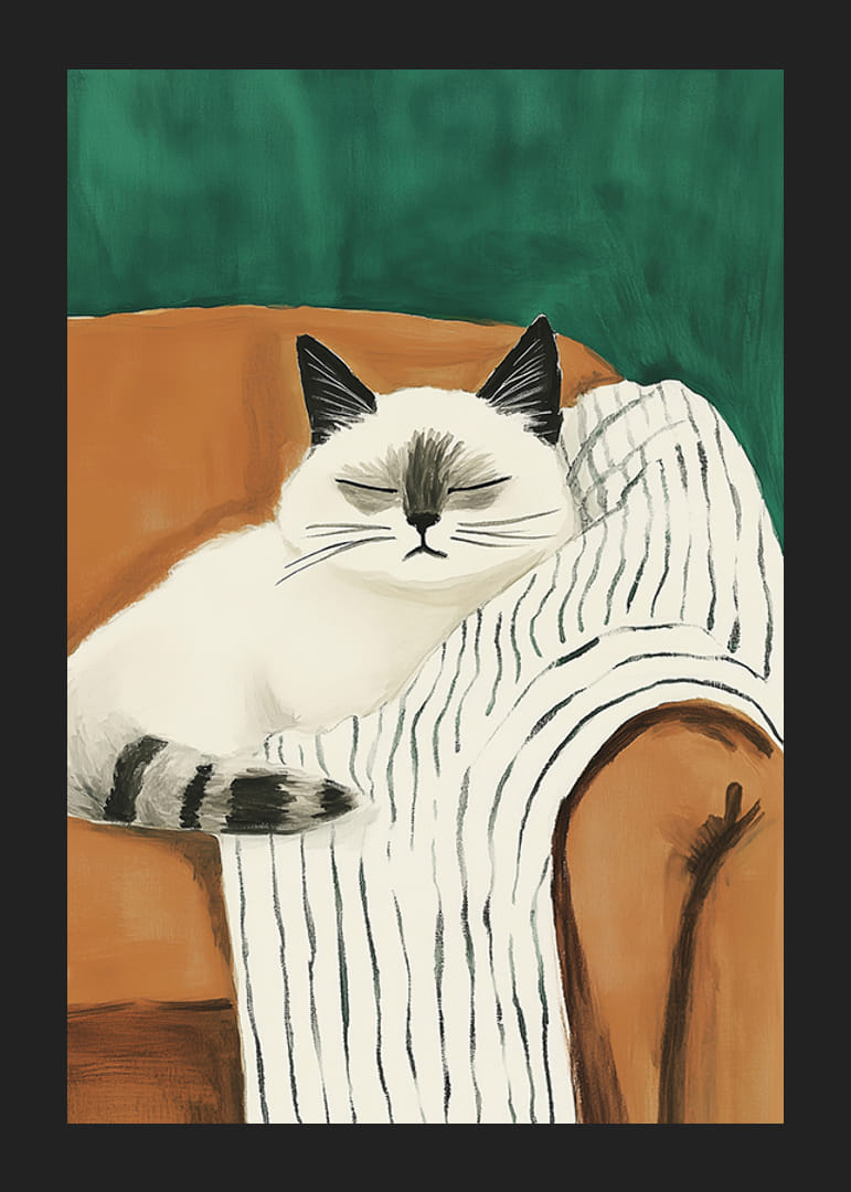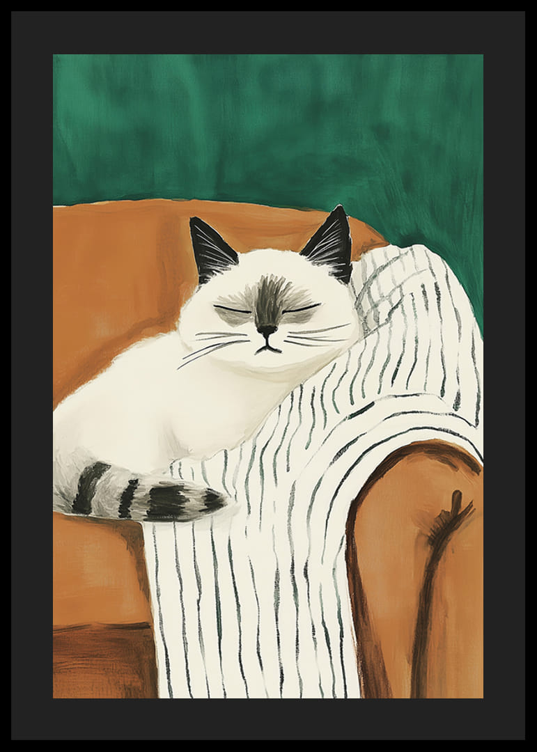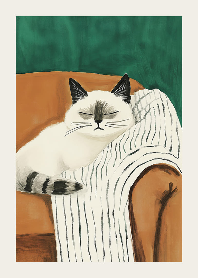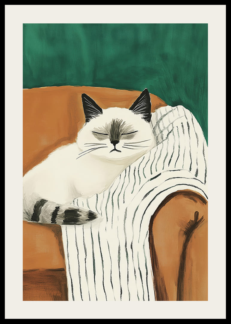 Očarujúci plagát zobrazujúci uvoľnenú mačku odpočívajúcu na mäkkej pruhovanej deke v teplom oranžovom kresle. S harmonickými farbami zelenej, bielej a hnedej vytvára motív upokojujúci a domácky pocit.