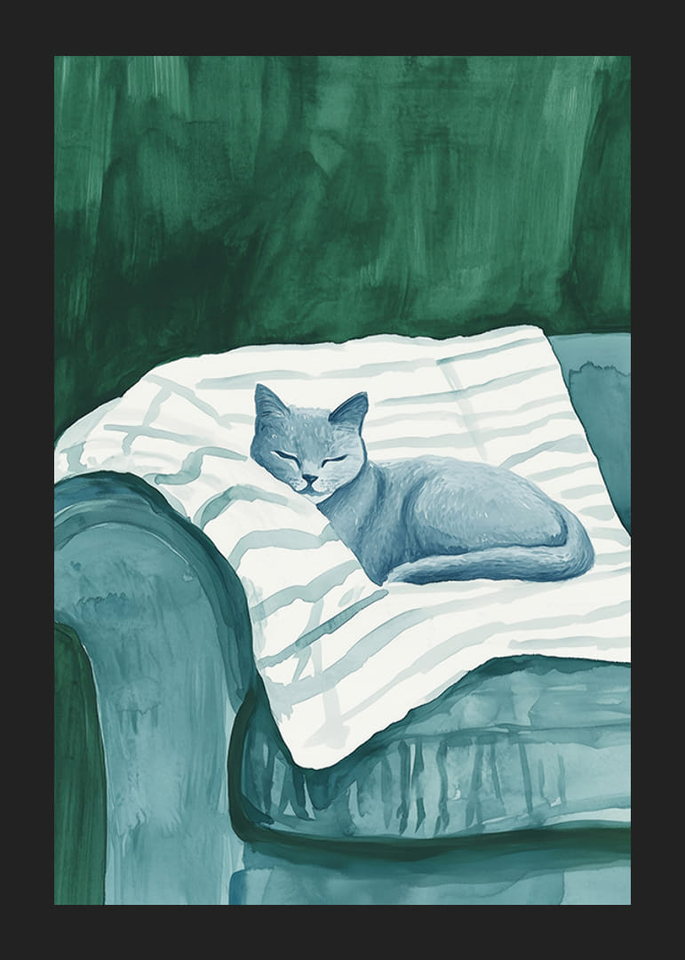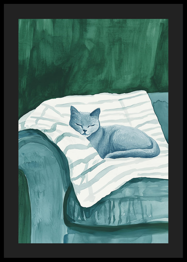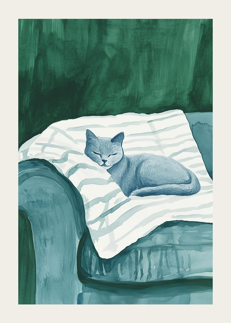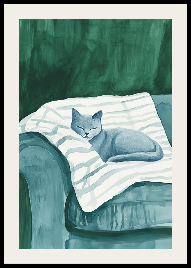 Štýlový plagát zobrazujúci spiacu mačku v jemných modrých tónoch, ako odpočíva na pruhovanej deke v čalúnenom zelenom kresle. Monochromatická farebná paleta vytvára pokojný a harmonický pocit, ideálny na to, aby váš domov získal modernú a uvoľnenú atmosféru.