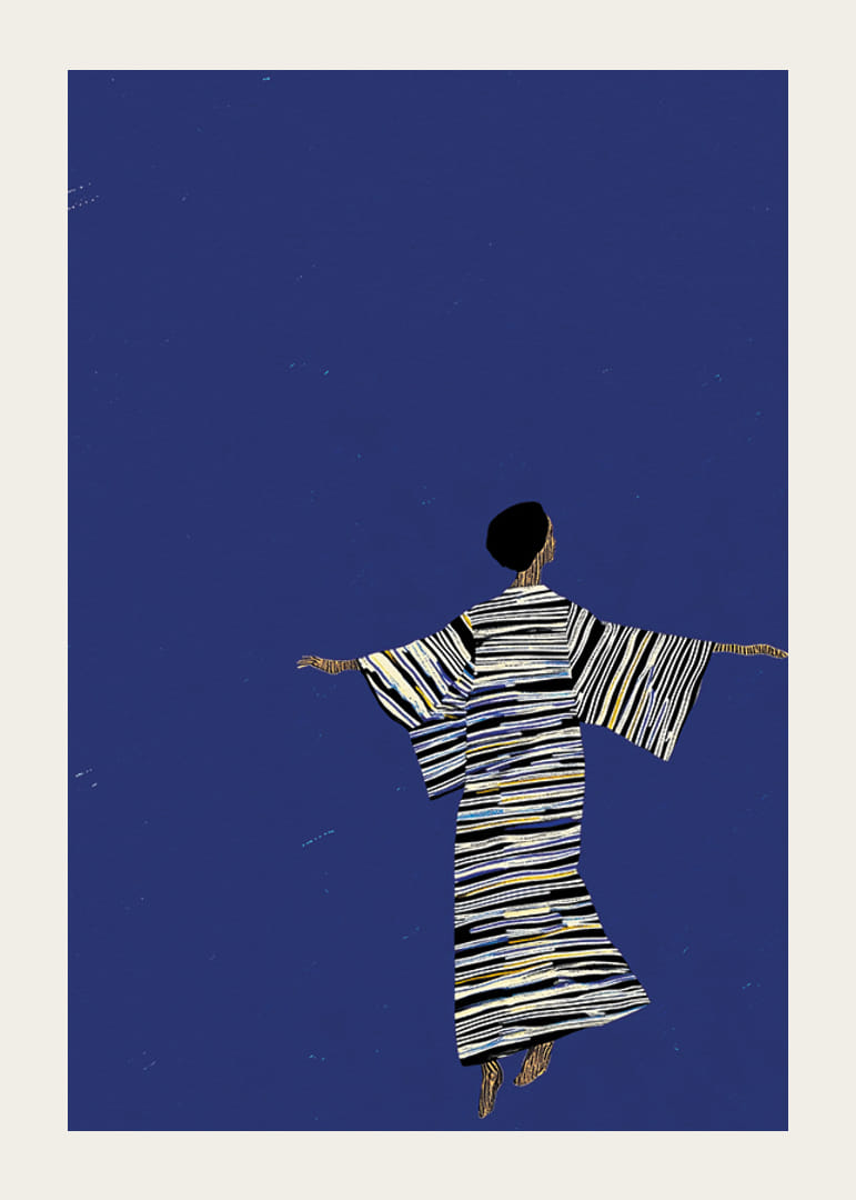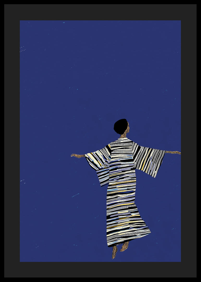 Tento jedinečný plagát zobrazuje štylizovanú postavu vo vzorovanom kostýme so zlatými a striebornými detailmi tancujúcu pod hviezdnou oblohou na tmavomodrom pozadí. Minimalistický dizajn v kombinácii s jemnými, trblietavými odtieňmi vytvára pocit elegancie a pohybu.