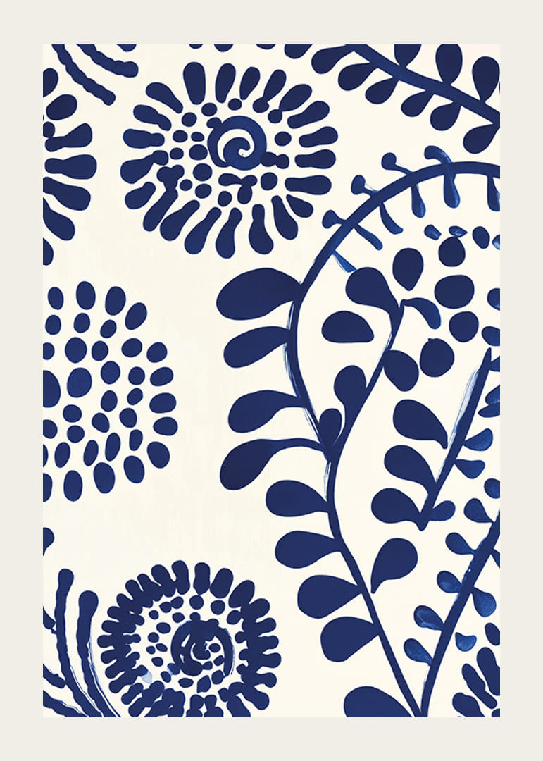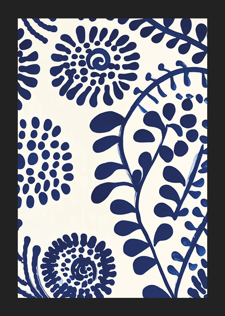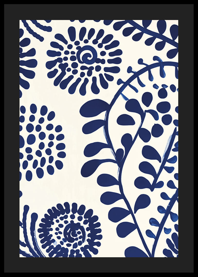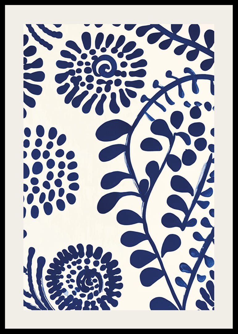 Tento štýlový plagát kombinuje abstraktné kvetinové vzory v hlbokej modrej na svetlom pozadí, čím vytvára harmonický a moderný dojem. Organické tvary a kontrastné farby dodávajú umelecký nádych, ktorý sa perfektne hodí do obývacích izieb aj spální a pozdvihne interiér nadčasovou eleganciou.