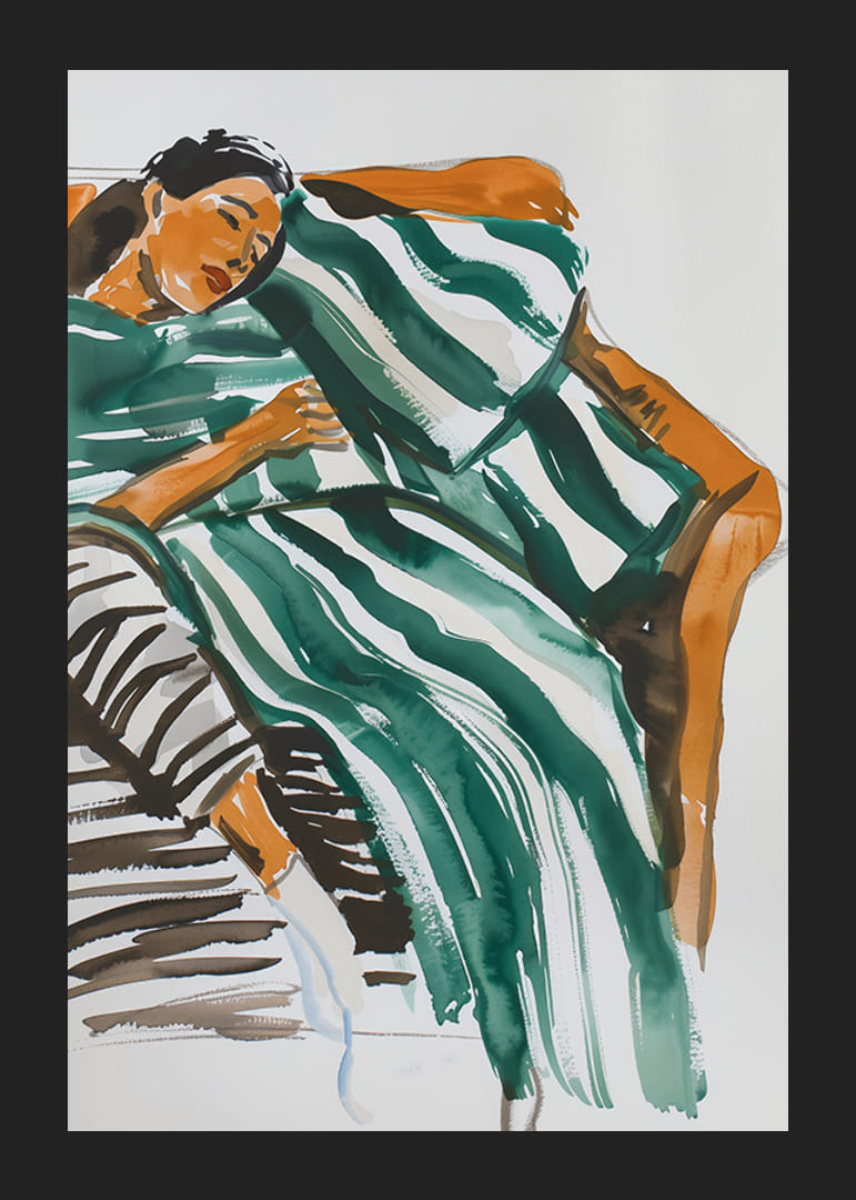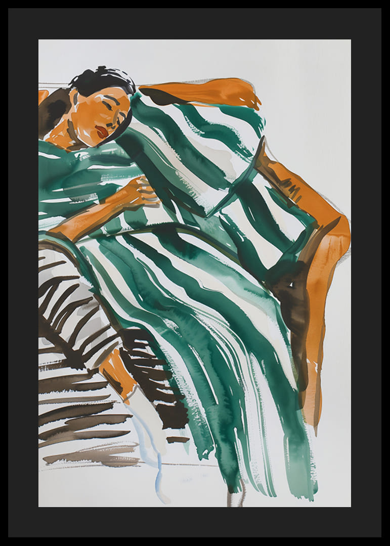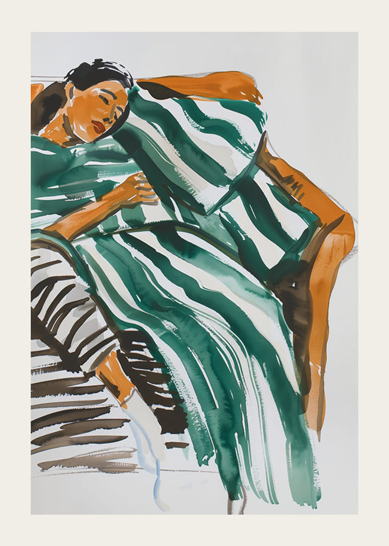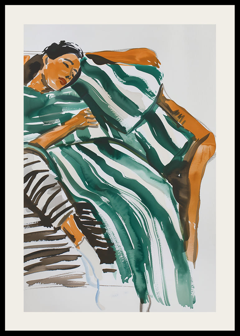 Tento uvoľnený plagát zobrazuje ženu pohodlne odpočívajúcu na oranžovej pohovke zabalenú do zeleno-bielej pruhovanej prikrývky. Jemné ťahy štetcom a teplé farebné tóny vytvárajú pocit pokoja a odpočinku, ktorý je ideálny na sprostredkovanie pokojnej atmosféry.