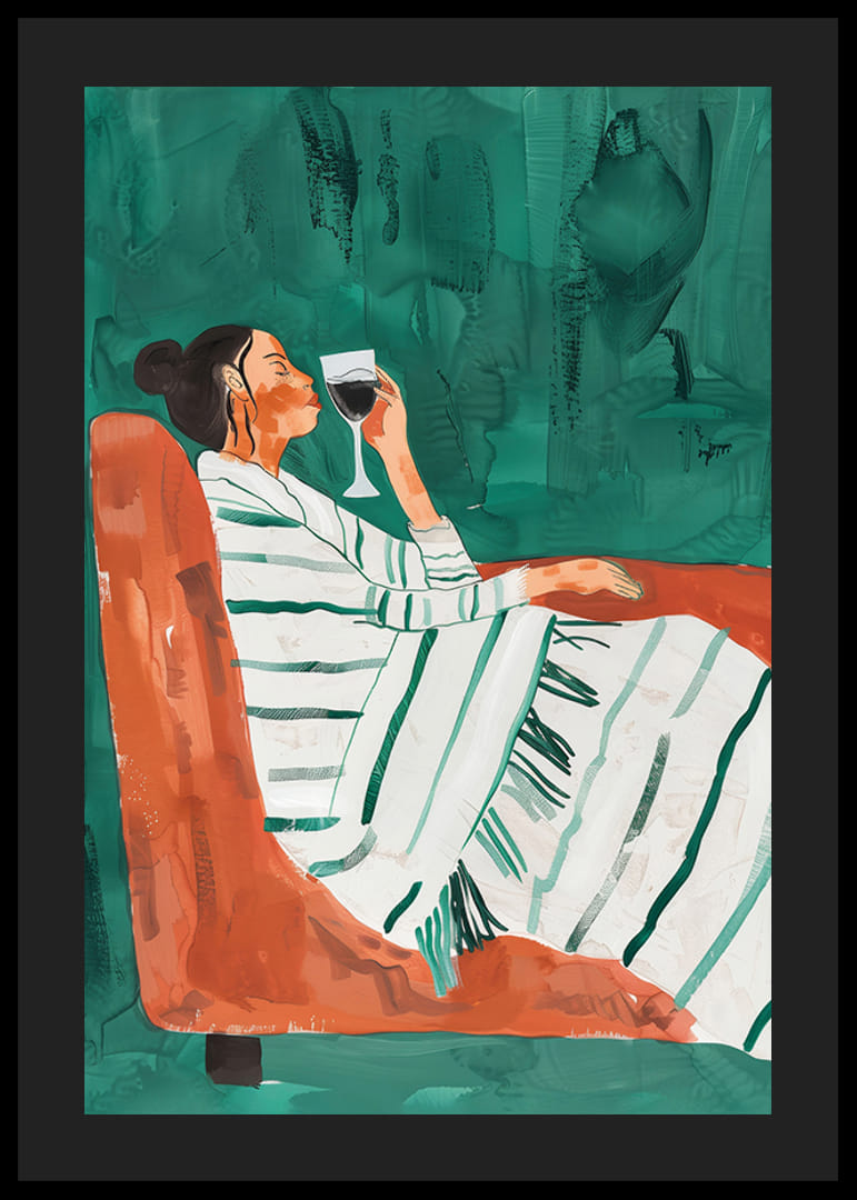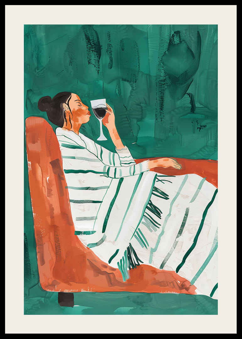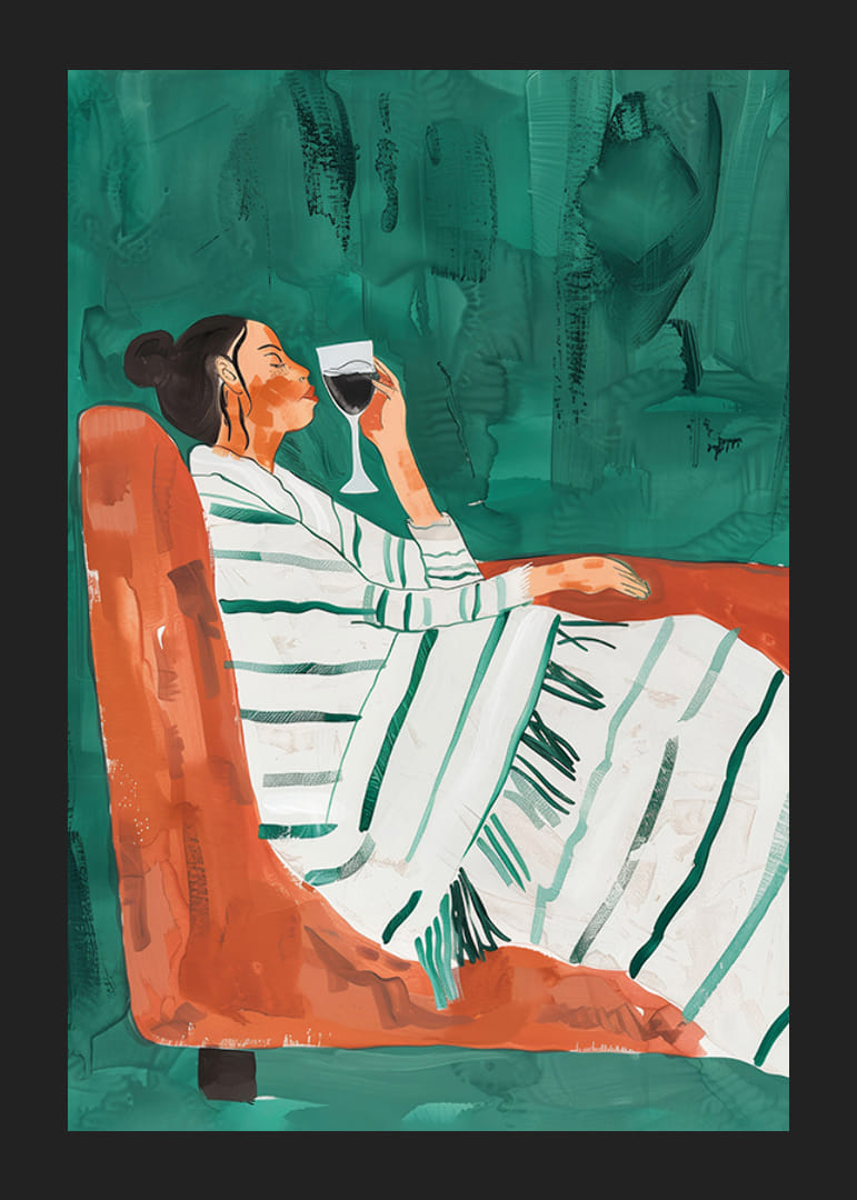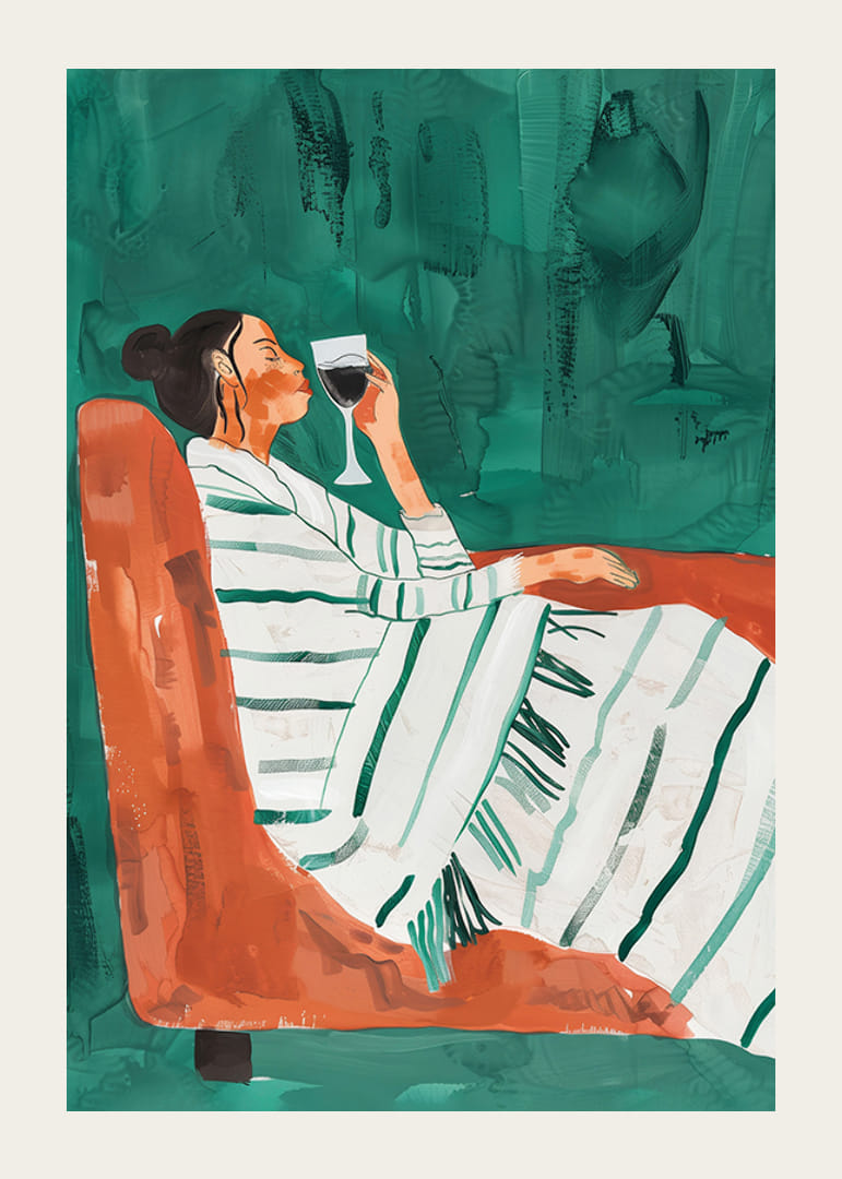 Táto štýlová ilustrácia zachytáva relaxačné chvíle s pohárom vína v ruke. Žena sa pohodlne opiera v teplom kresle, zabalená do mäkkej deky, obklopená harmonickými farbami.