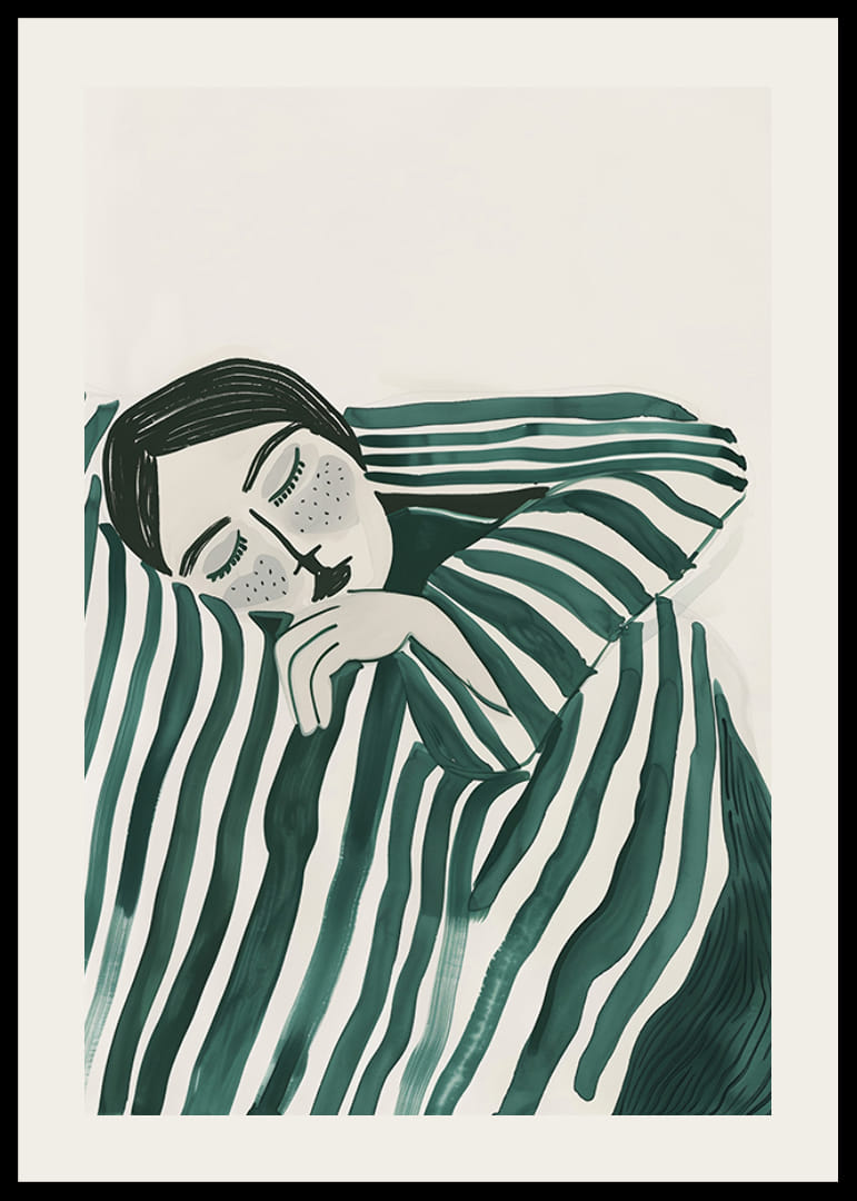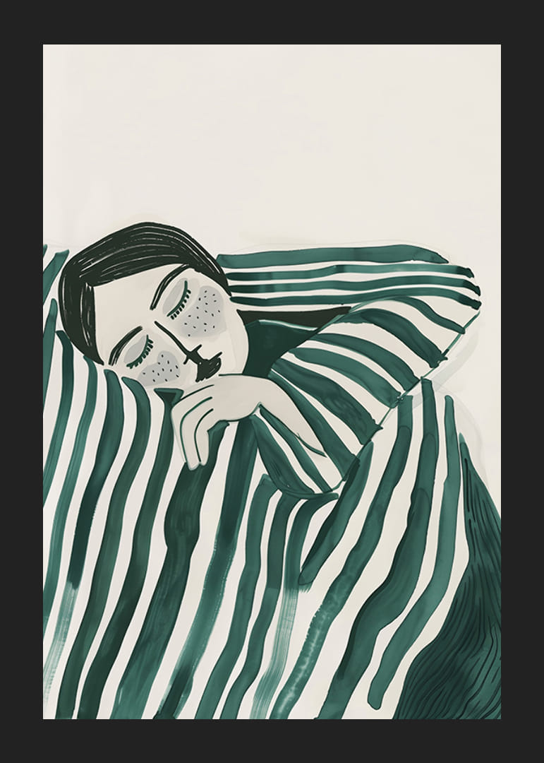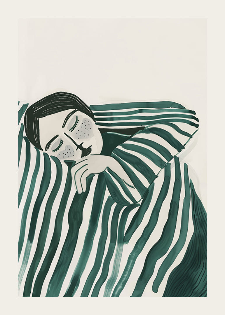 Táto krásna ilustrácia zachytáva okamih hlbokého odpočinku a pokoja. Človek zaspal, zabalený do mäkkej pruhovanej prikrývky, s pokojným výrazom. Elegantné ťahy štetcom a tlmená paleta farieb vytvárajú pocit harmónie a pokoja.