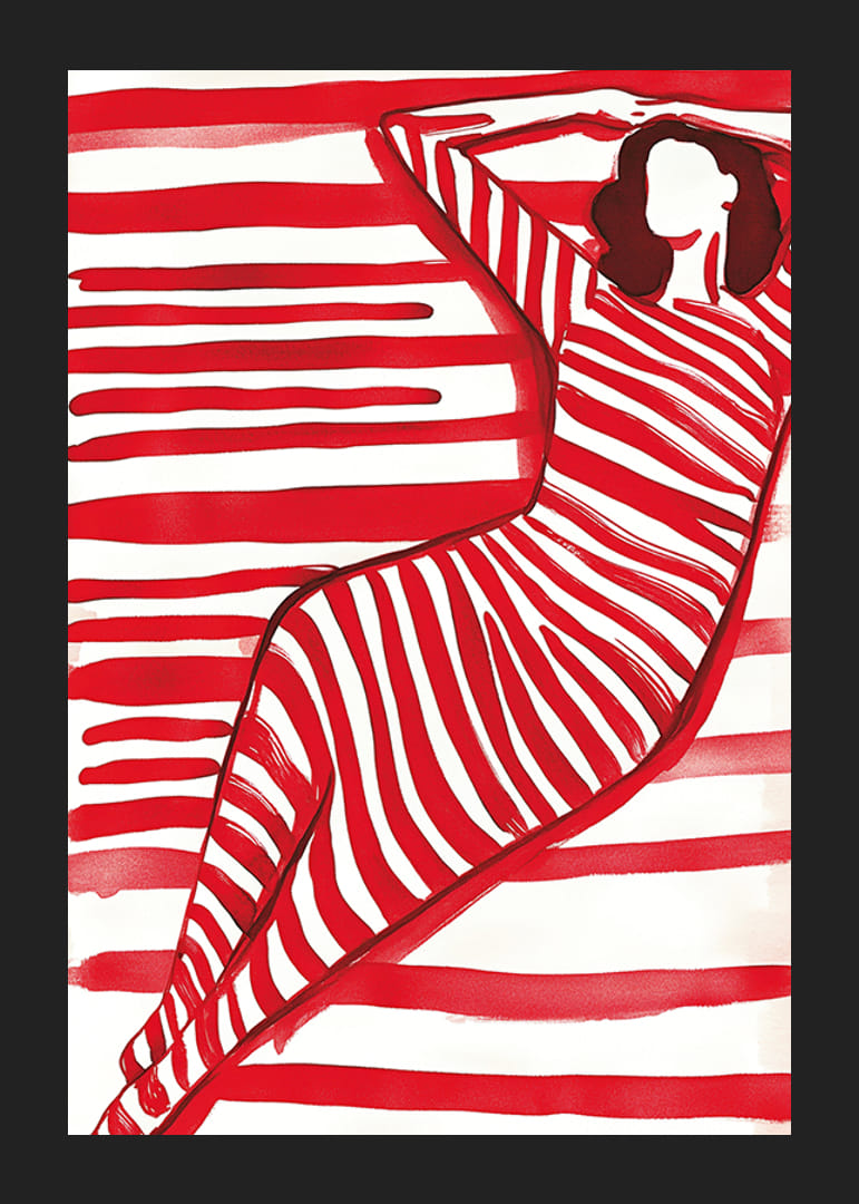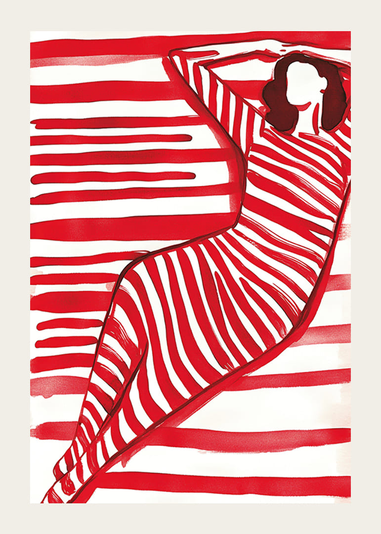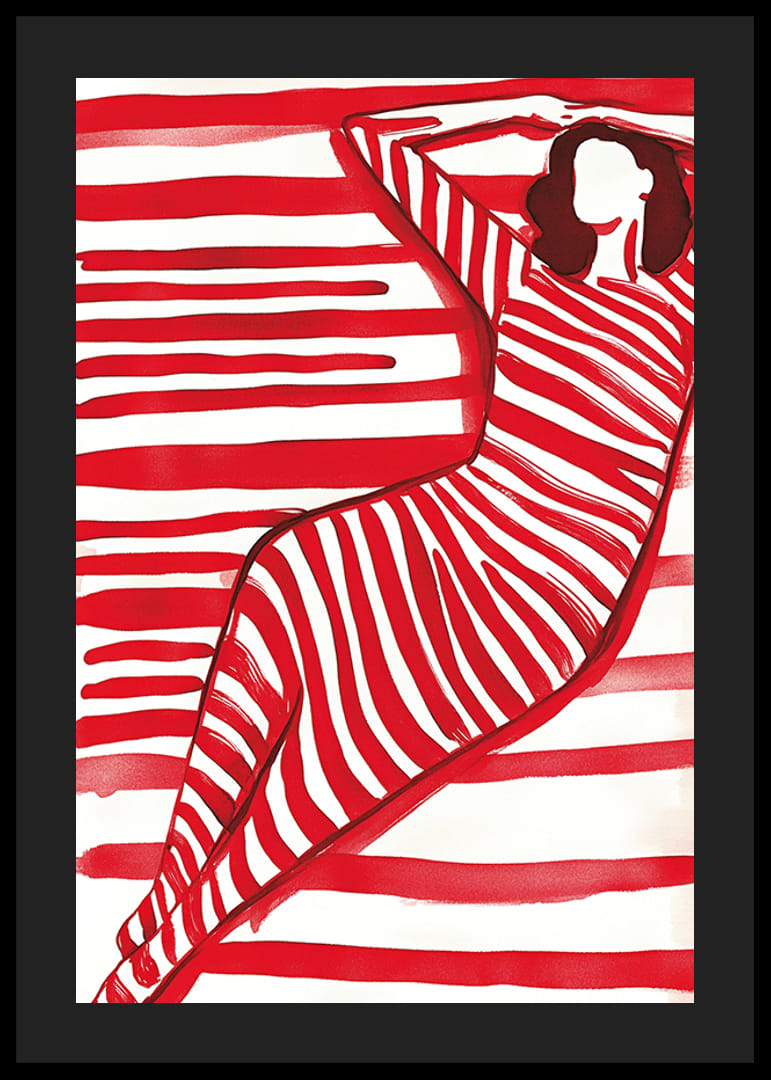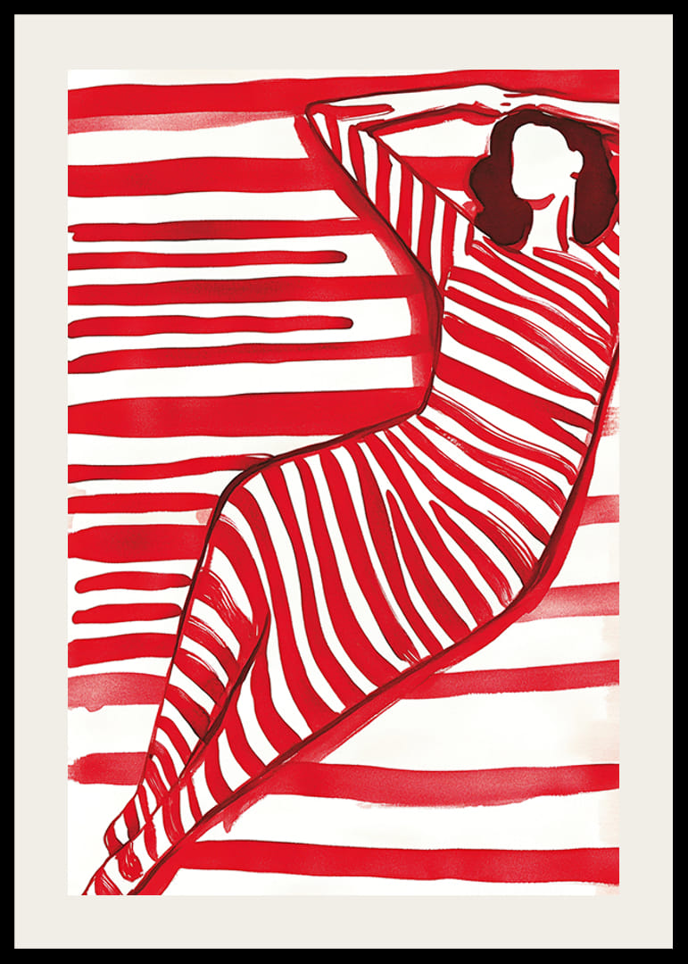 Objavte fascinujúci svet červených a bielych čiar na tomto umeleckom plagáte! S výraznou siluetou, ktorá sa spája s grafickým vzorom, dáva hravý, ale sofistikovaný výraz. Ideálny na oživenie každej miestnosti, kombinuje minimalistický dizajn s výraznou energiou.
