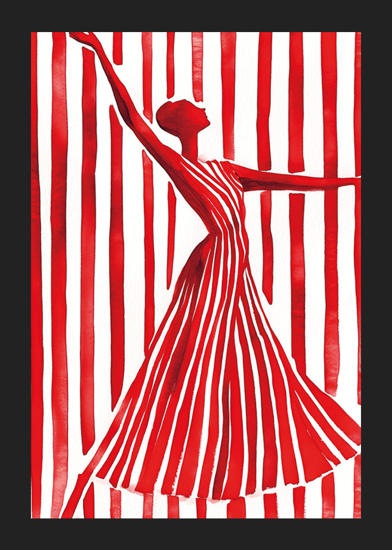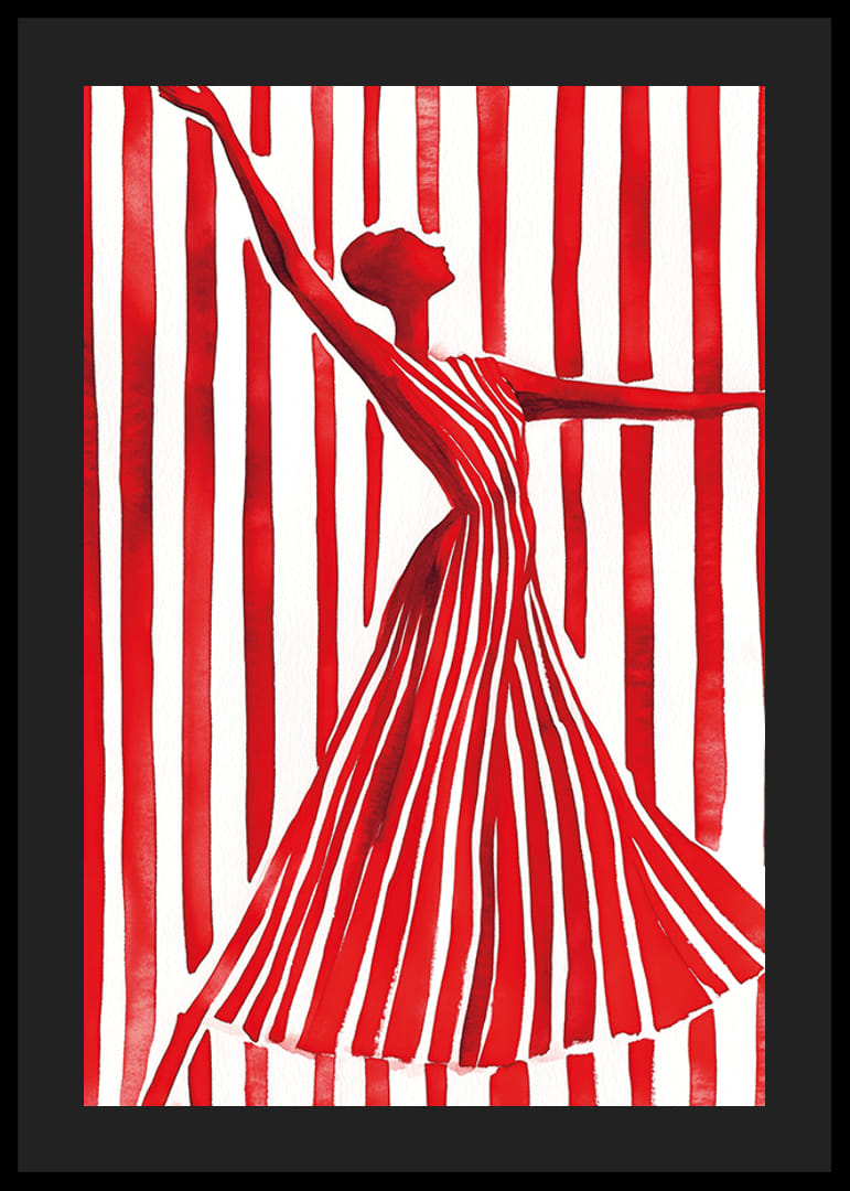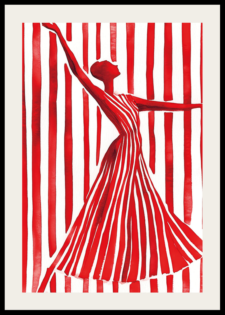 Zažite silu a eleganciu tohto dynamického plagátu, kde silueta v červeno-bielych pruhovaných šatách siaha ku hviezdam. Výrazné línie a kontrastná paleta farieb upútajú pozornosť a inšpirujú dušu.