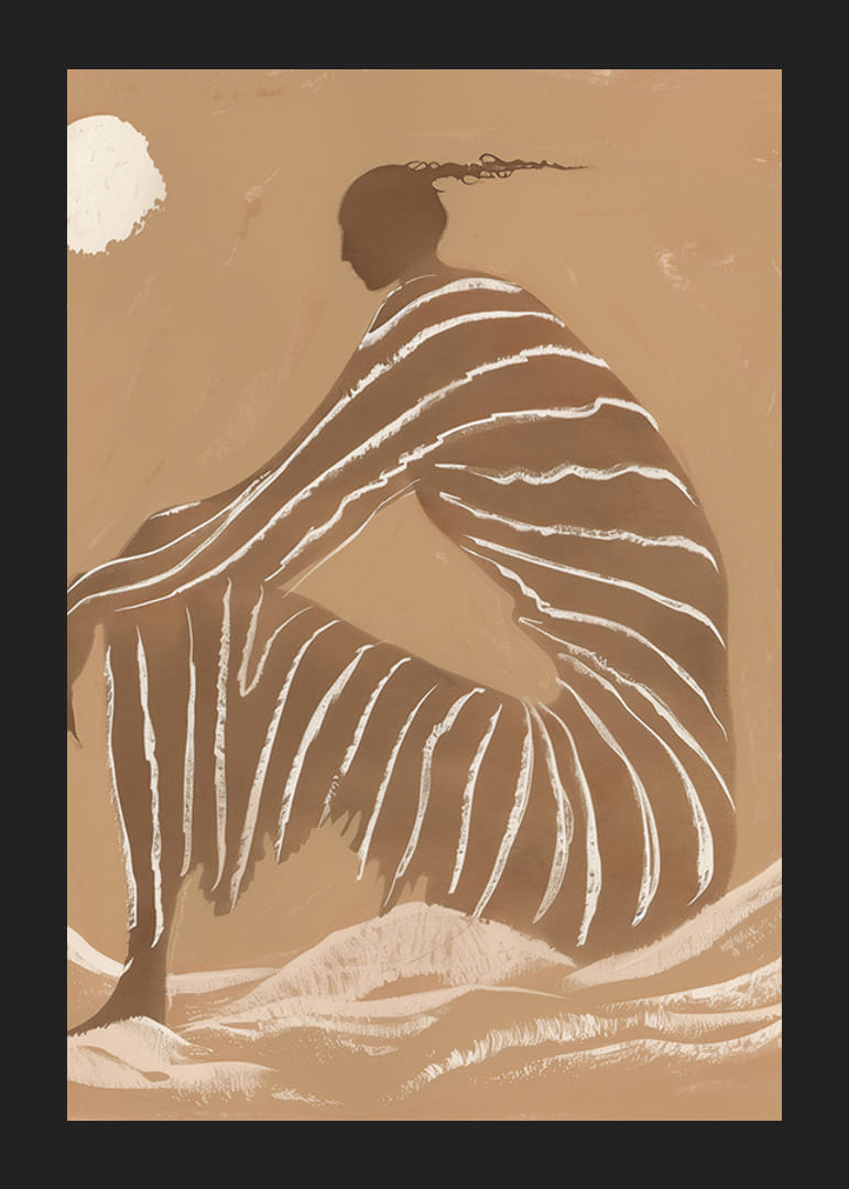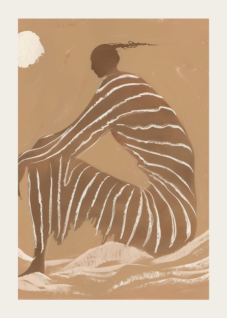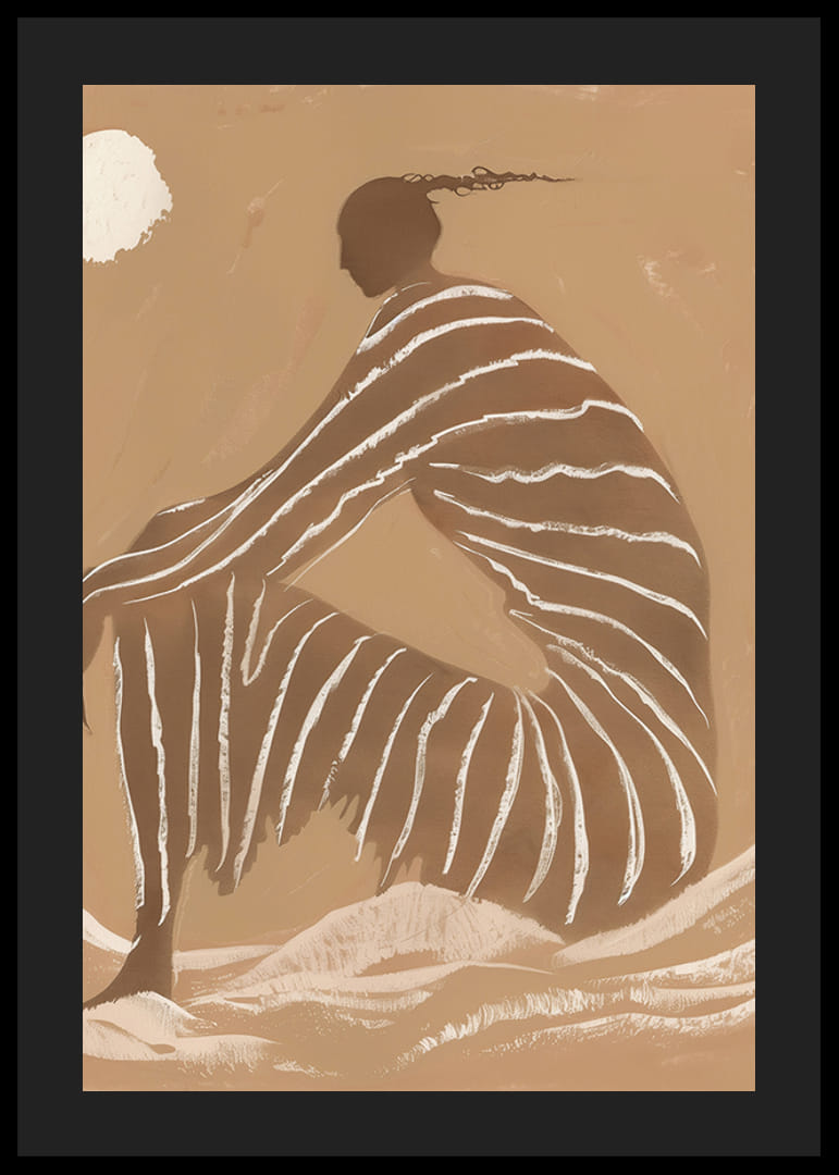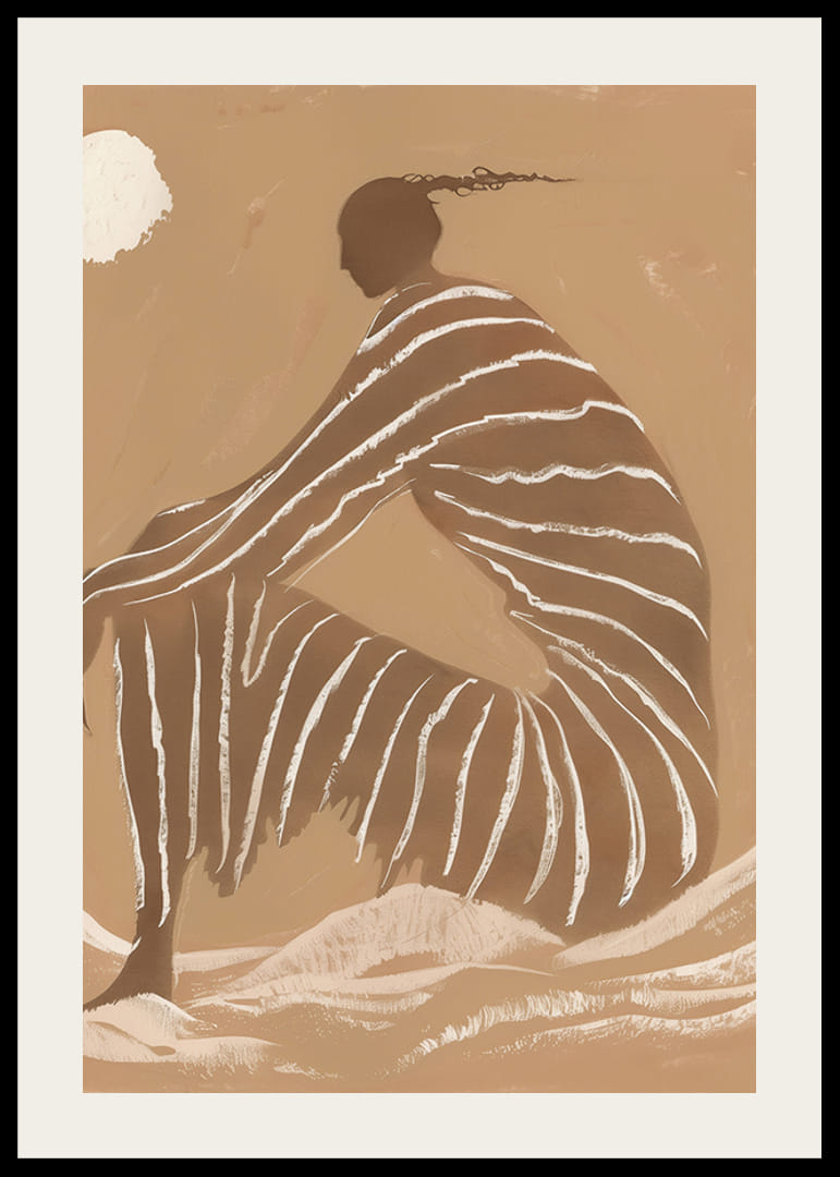 Objavte svet tajomstva a elegancie s týmto fascinujúcim plagátom, kde silueta postavy obalená pruhmi vytvára pocit hĺbky a pokoja. Pozadie v zemitých tónoch umocňuje atmosféru nadčasovosti a snovej krásy.