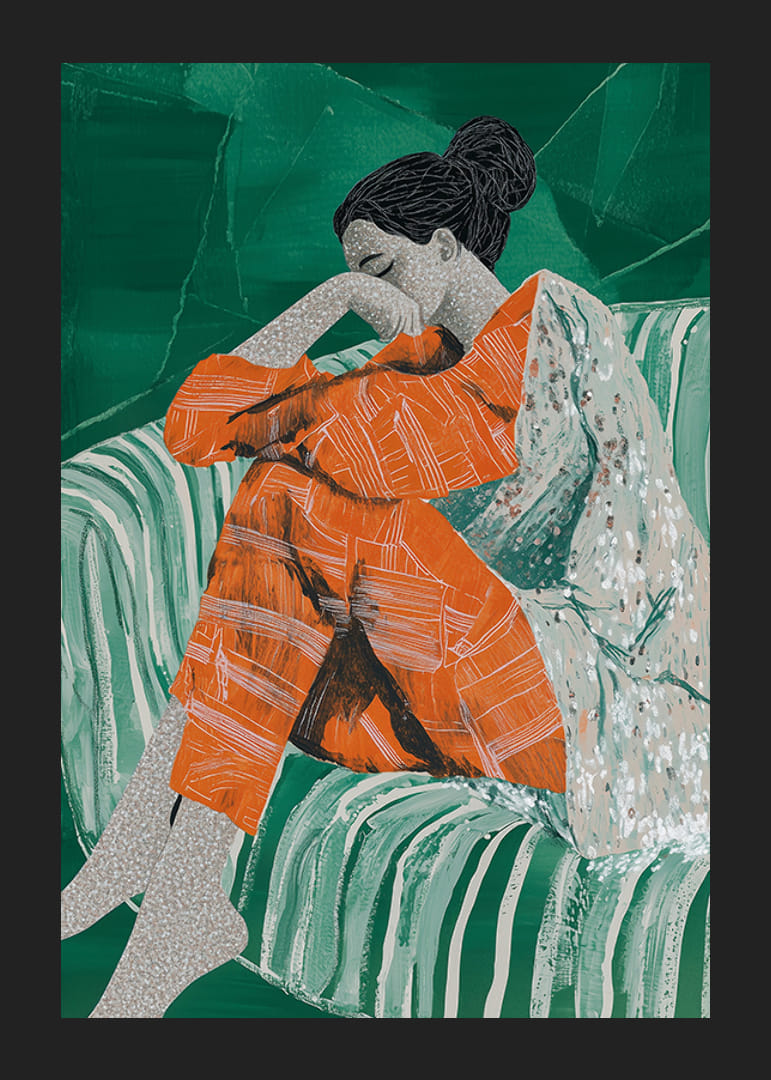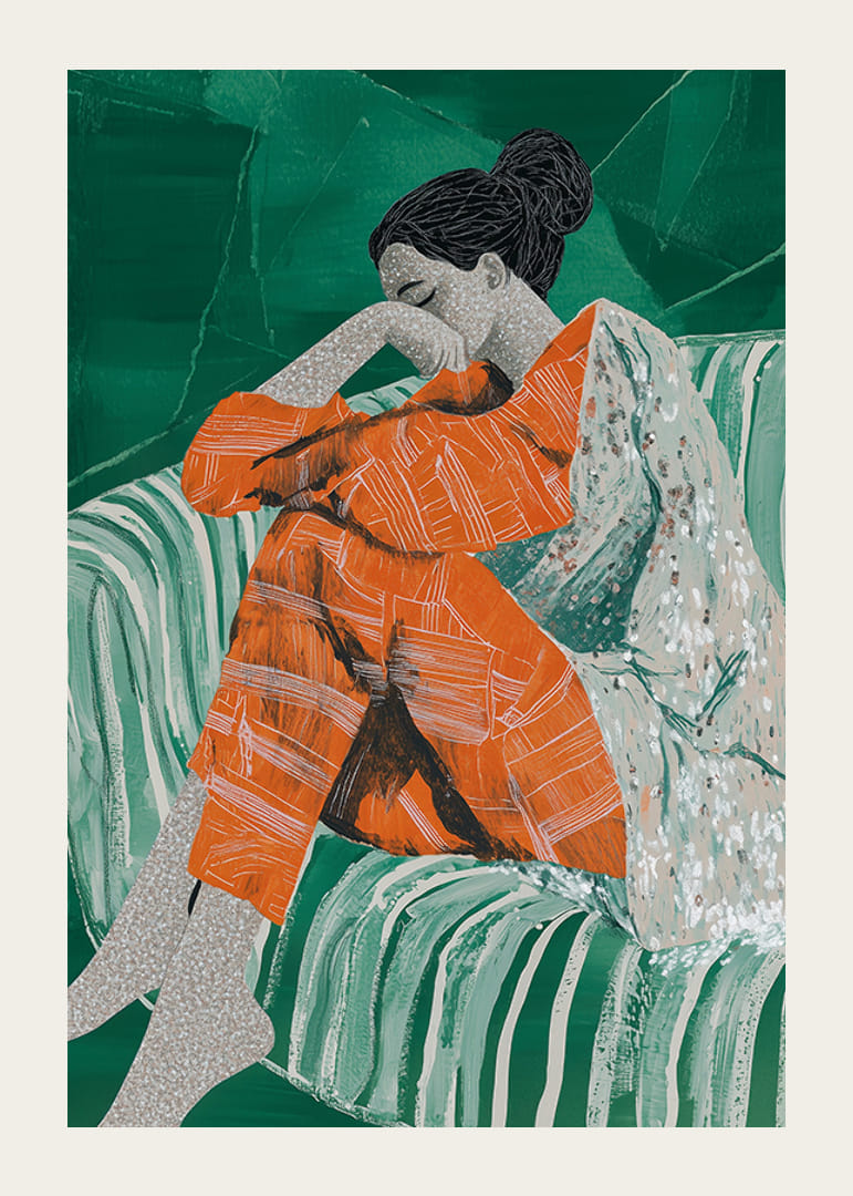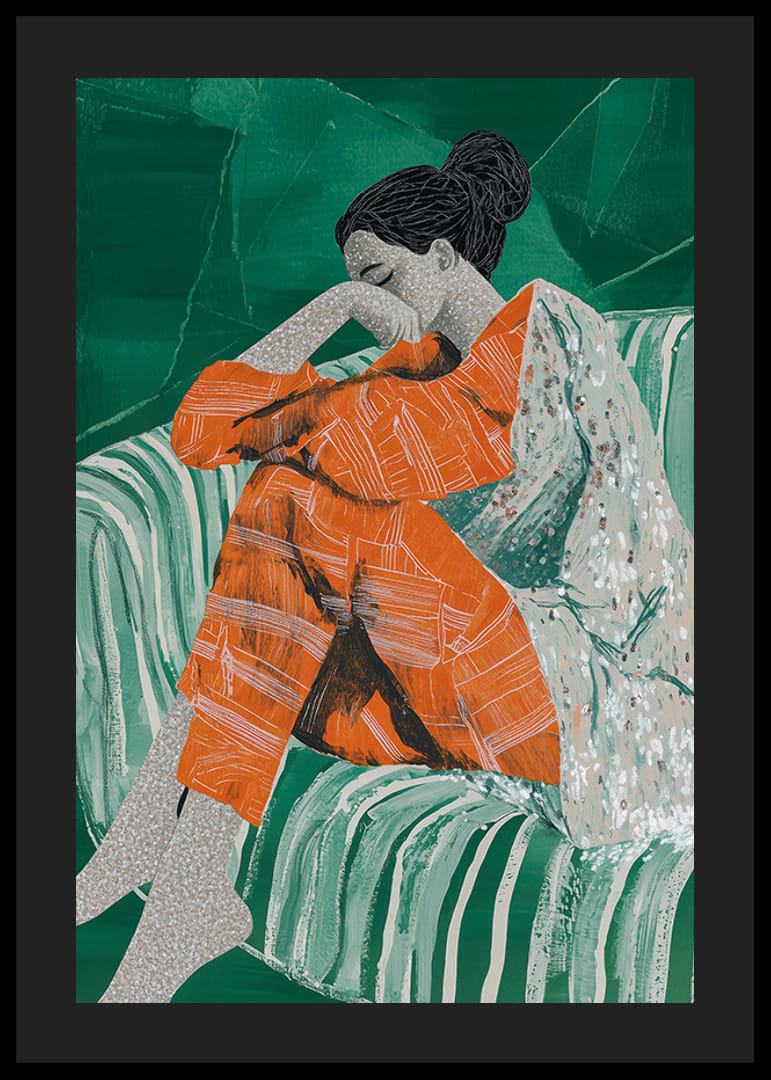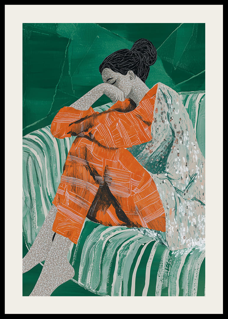 Ponorte sa do tohto podmanivého plagátu, kde na pohovke odpočíva žena v hlbokom zamyslení. Živé, teplé oranžové tóny jej oblečenia krásne kontrastujú so sýto zeleným pozadím a vytvárajú harmonickú rovnováhu medzi energiou a pokojom.
