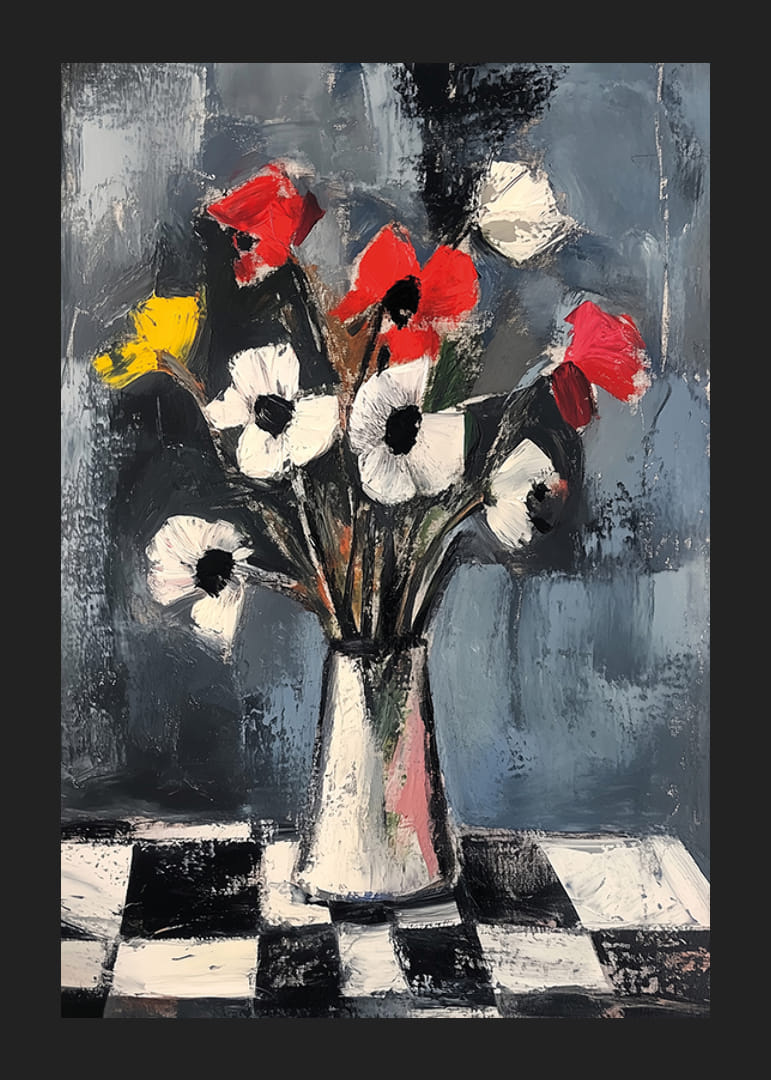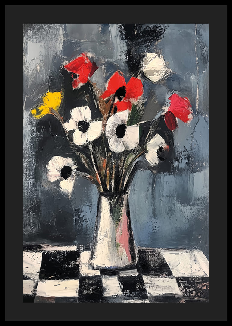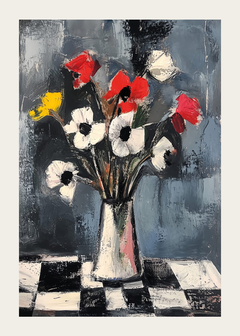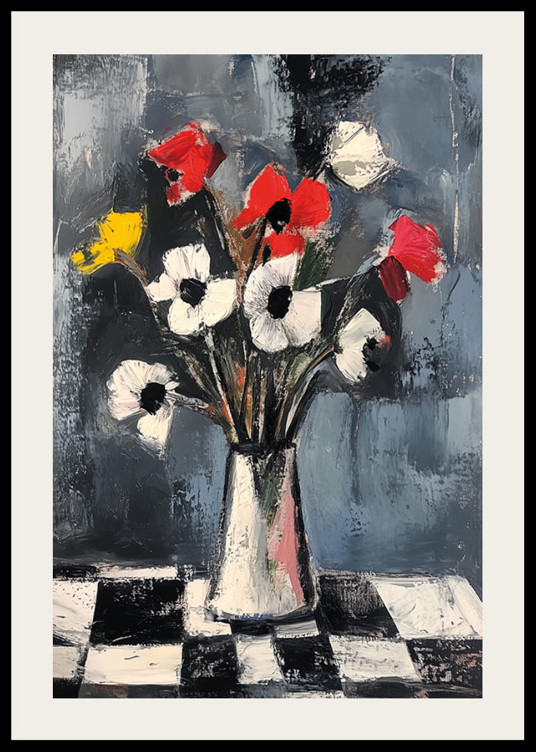 Tento plagát s explóziou žiarivých farieb na tlmenom pozadí upúta pozornosť výraznými ťahmi štetca a kontrastnou kompozíciou. Červené, biele a žlté tóny kvetov tancujú po čierno-bielom kockovanom vzore.